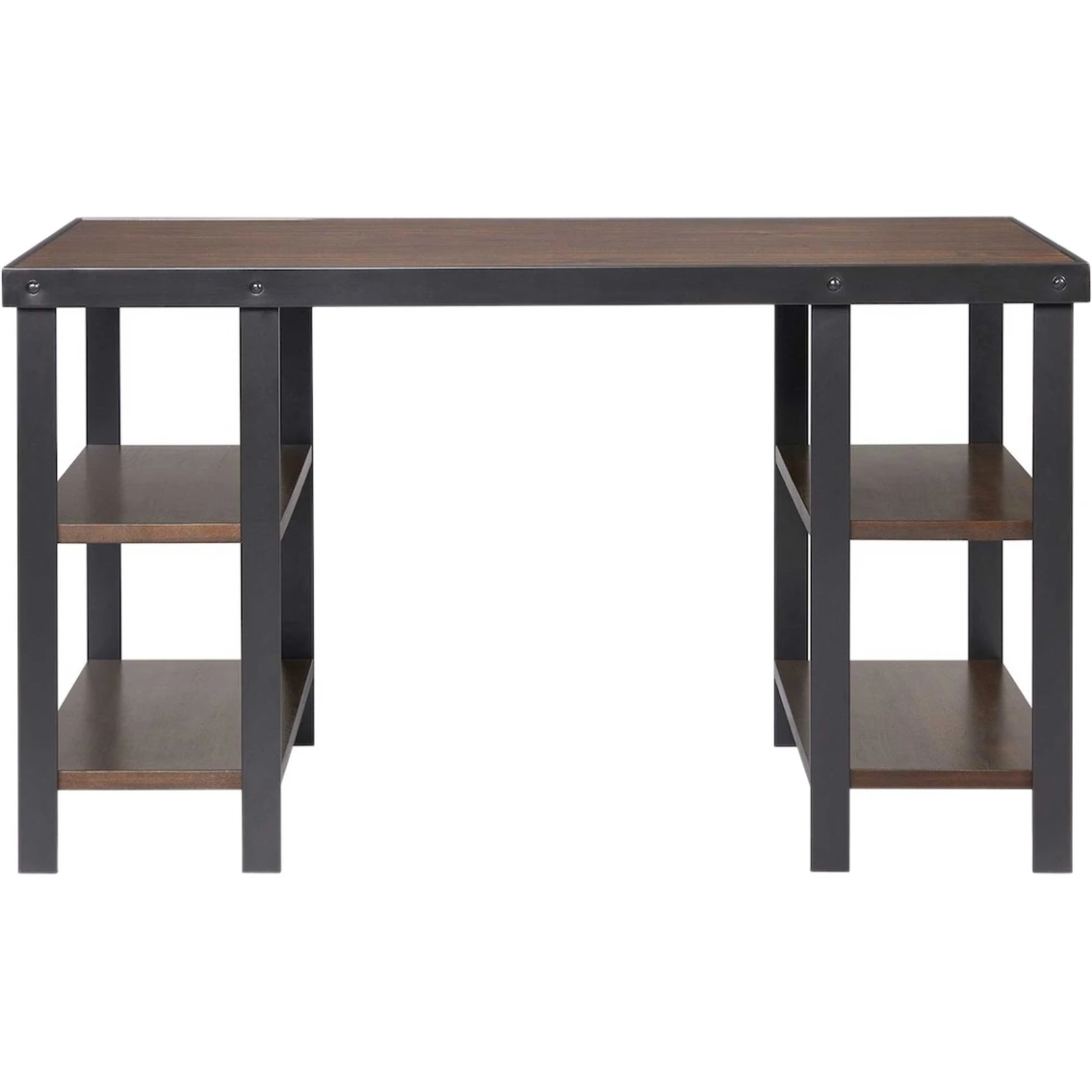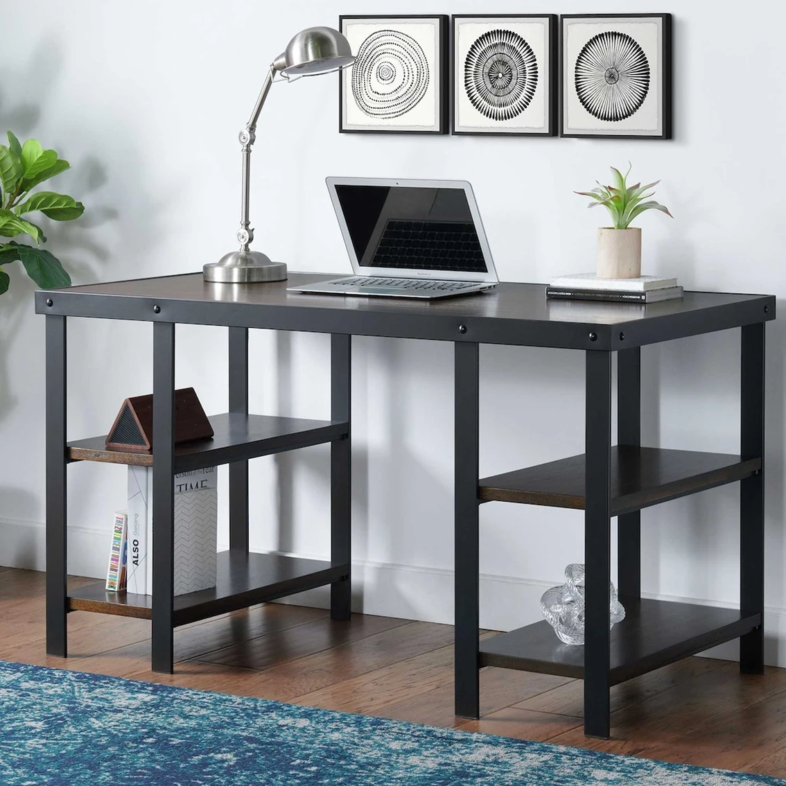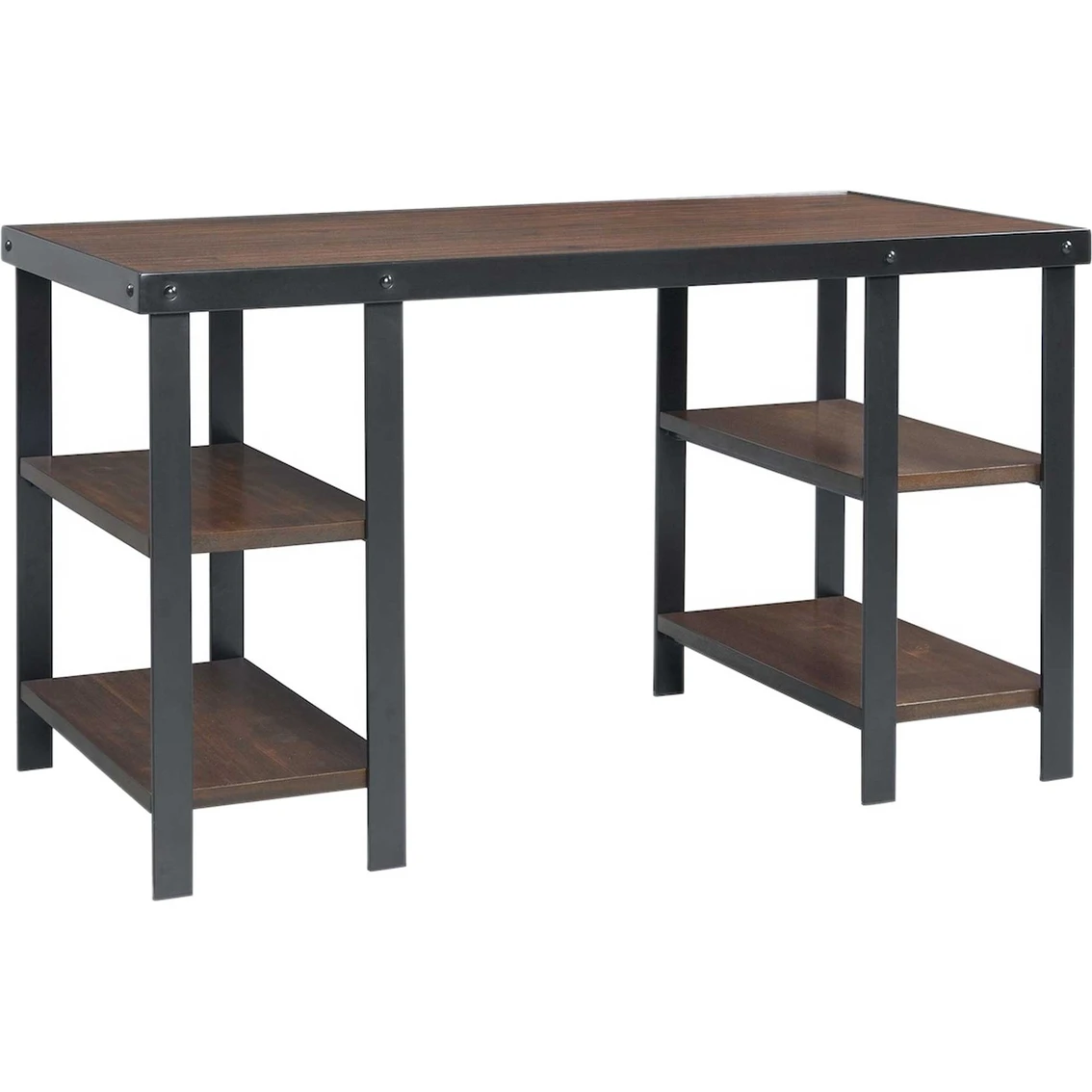 The Elements Jolene Desk with Veneer Top makes work in high style with this laptop desk with bookcase. This desk comes with a sleek desk with two shelves to hold your desktop or a printer. Distressed warm brown and gunmetal finishes give the modern, open-concept design a dramatic touch. Model: A.9292.DK.