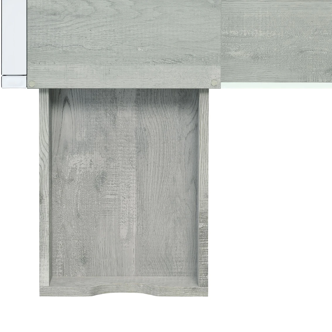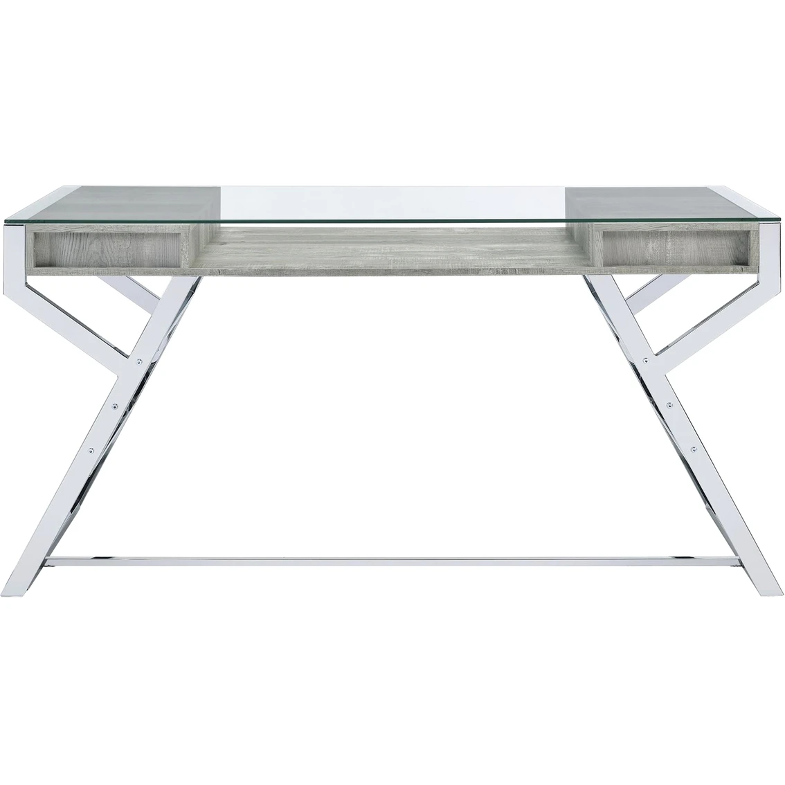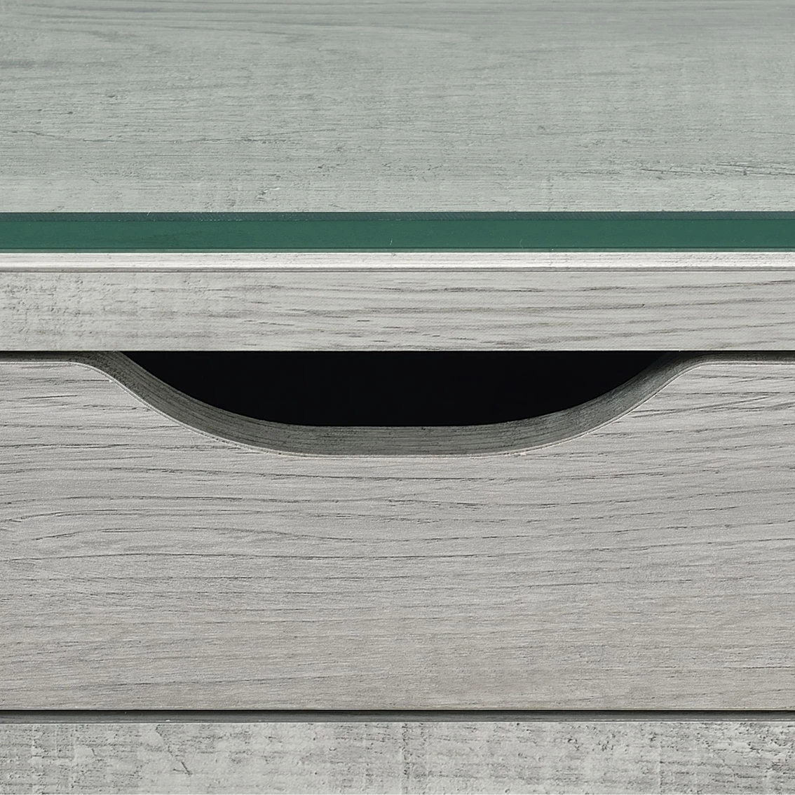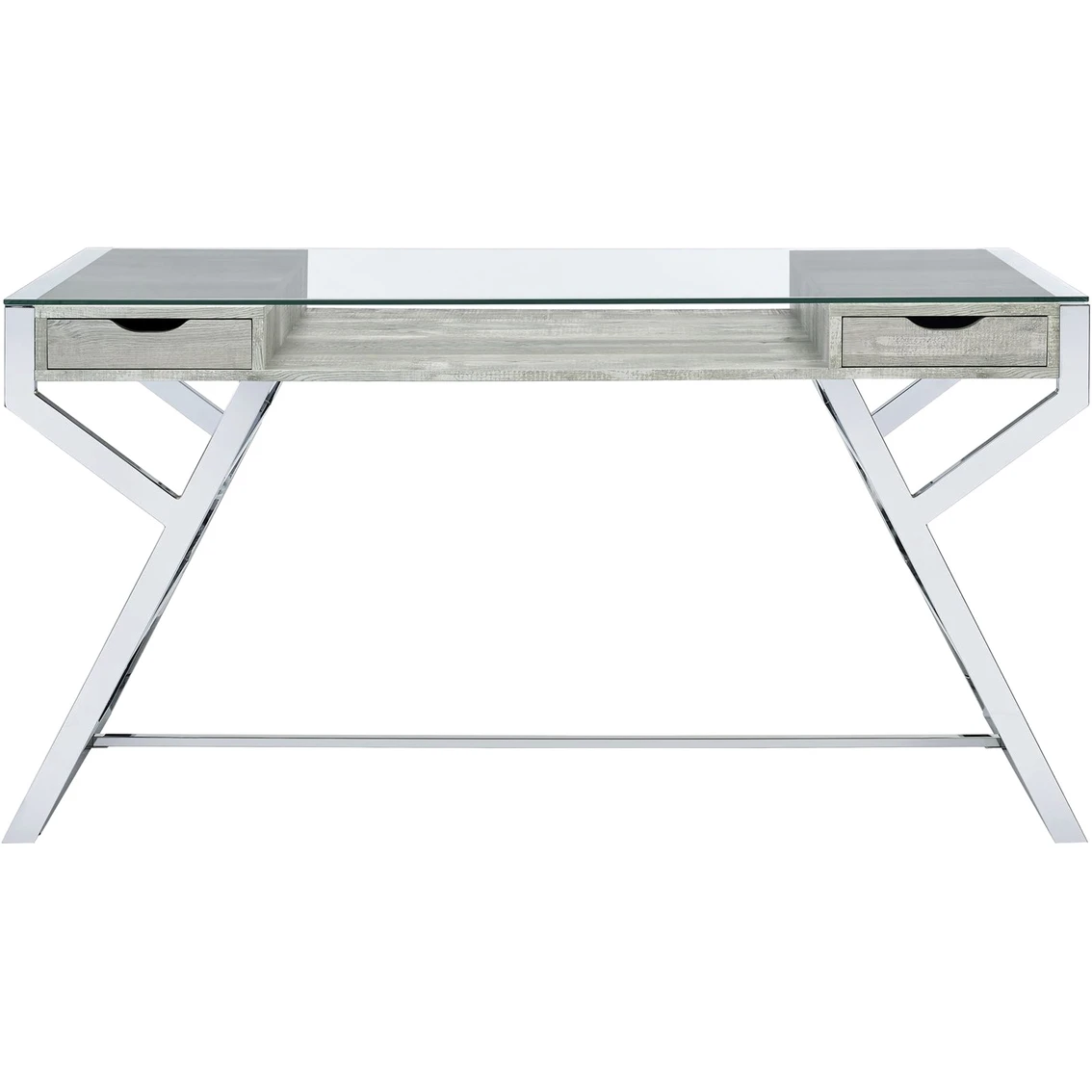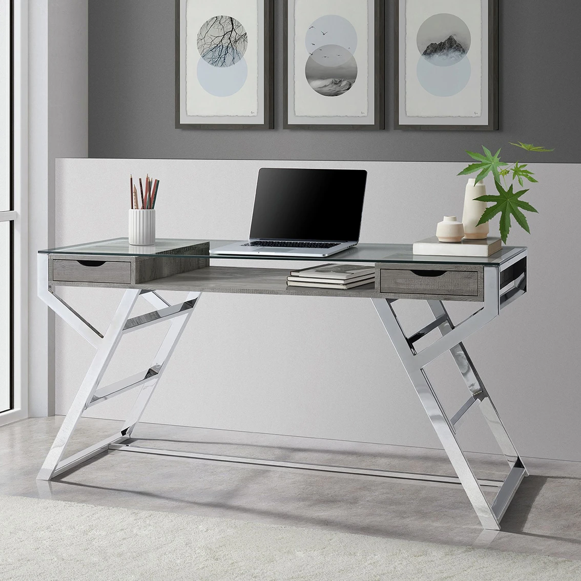 The Elements Lovett desk is designed on trend and functional. This rectangular writing desk is just what your modern home office is missing. With a sleek tempered glass top, distressed drawers and a metal chrome base for a touch of contrast. Features two spacious drawers, allowing you tuck away your notepads and pens while an open center compartment makes it easy for you to keep your desk clean. Whether for working or crafting, this desk will make sure you get it all done in style. Some Assembly Required (Tools Included). Model: CKLV100DK.
