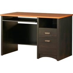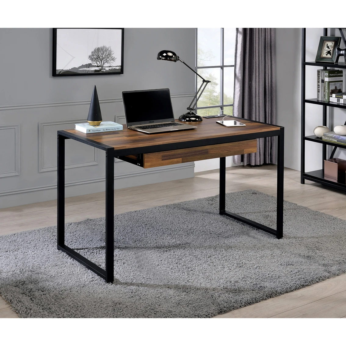 A simple silhouette and a beautiful mixed material construction make this Furniture of America Quincy Dark Oak Desk a popular option for those wanting a stylish industrial piece for their home office. The sand black metal frame holds the sleek table top and drawer with panels featuring beautiful veneer work. Plus, two power outlets and two USB charging ports are here to keep your devices juiced up for whatever work needs to be done. Model: CM-DK913.