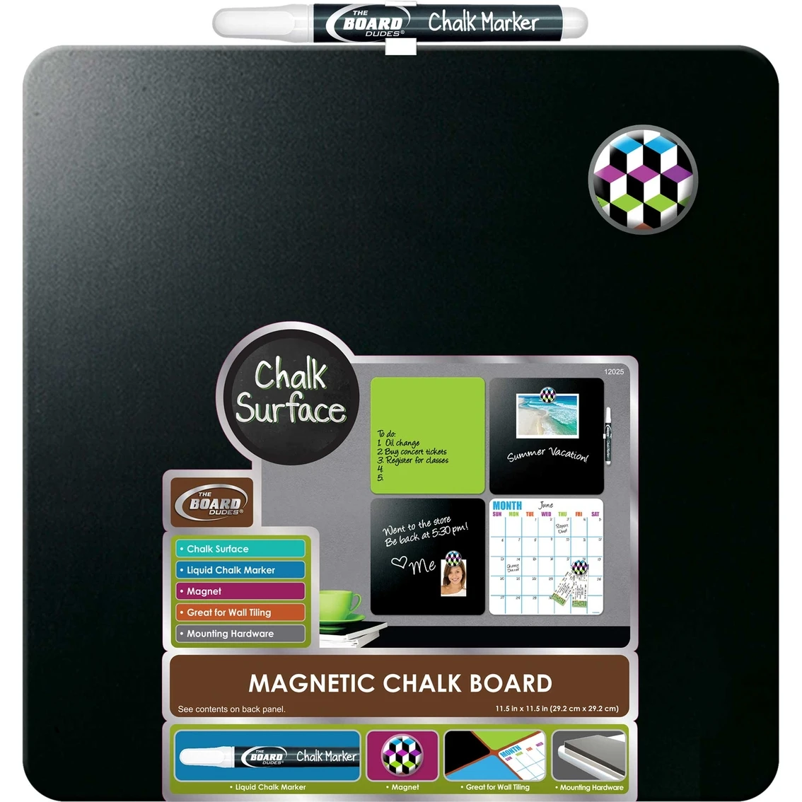 | Includes | 1-black dry erase board, 1-white liquid dry erase chalk marker, 1-button magnet, pen clip and mounting hardware |