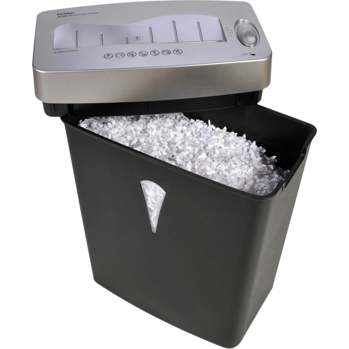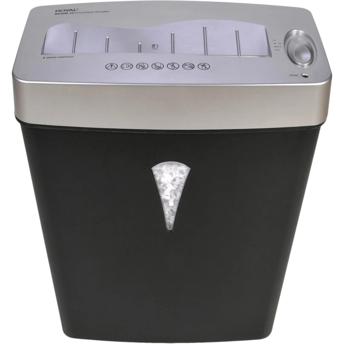 The MC500 5-Sheet shredder from Royal reduces your documents to micro particles in a single pass. Shred credit cards, staples, paper, clips and more. Efficiently handles up to five sheets in a single pass. Model: 29366Y.