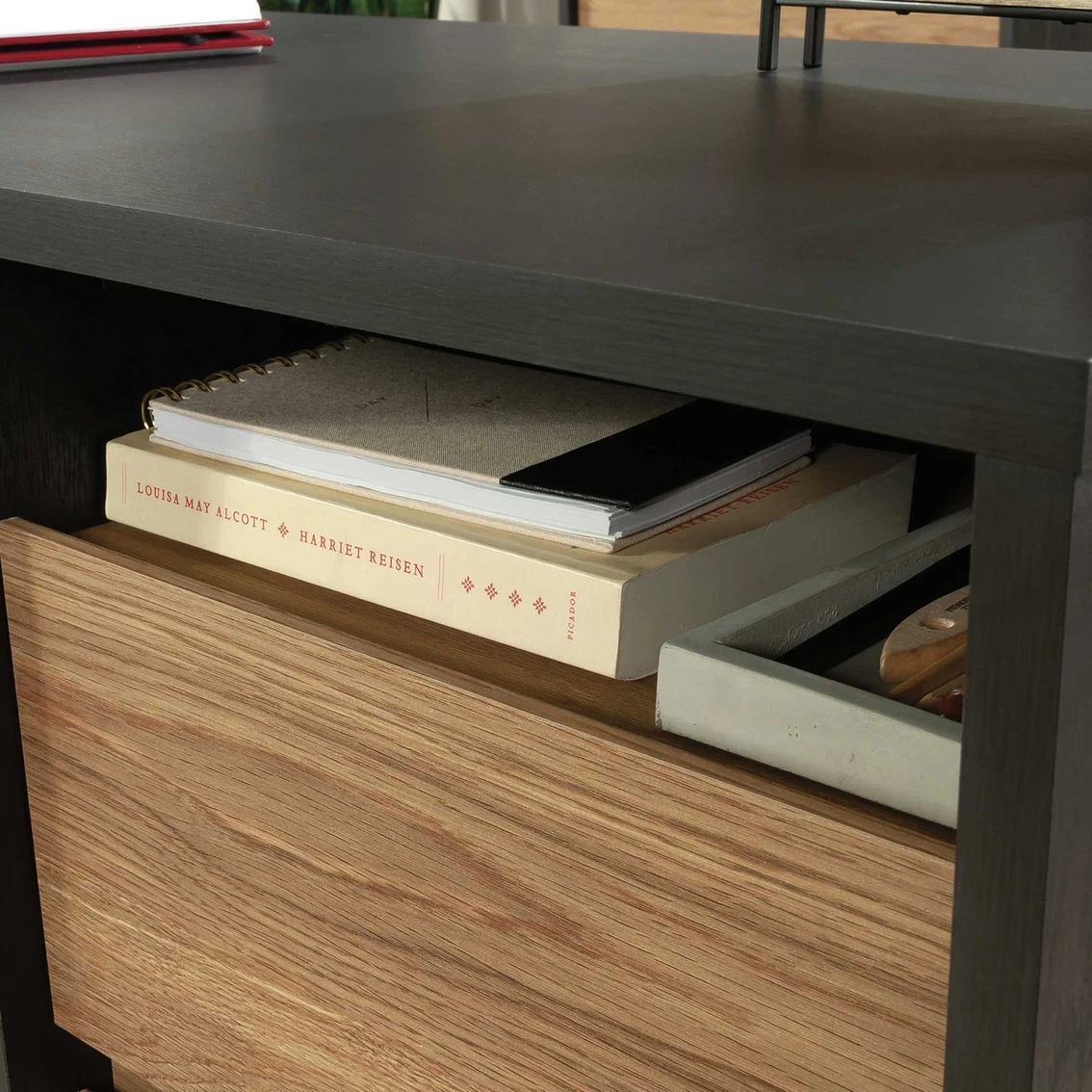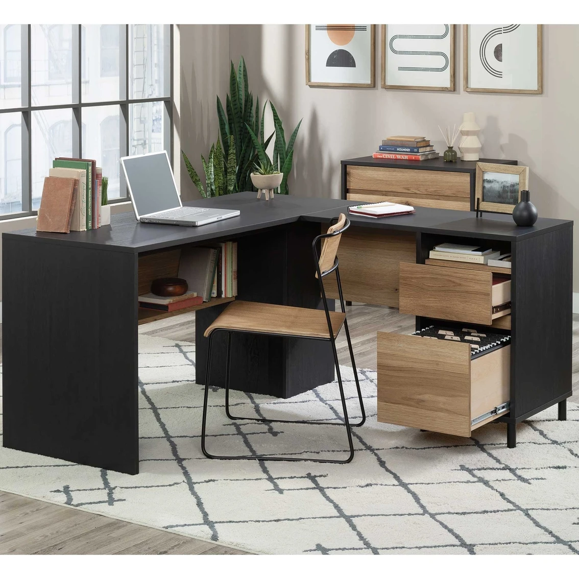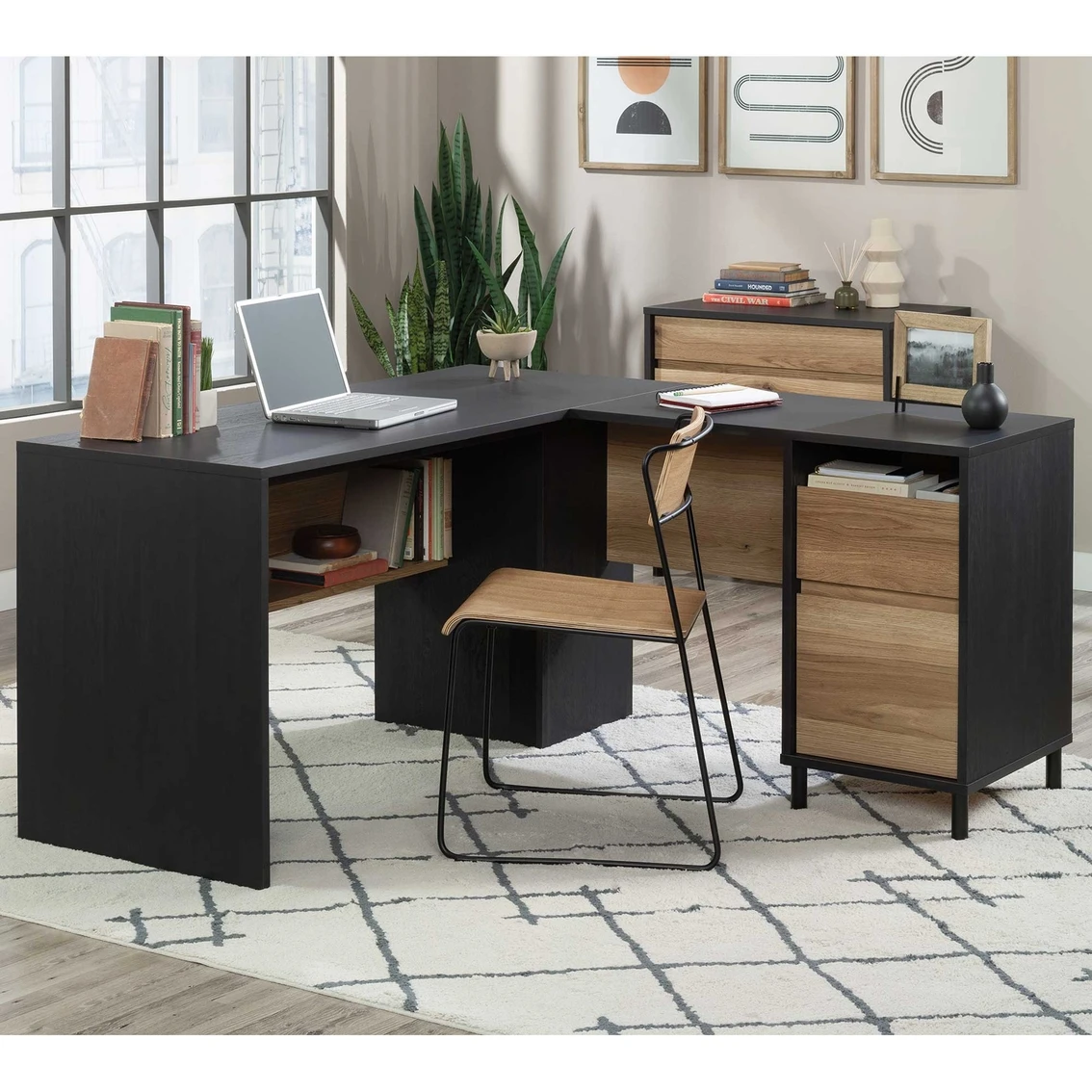 This item ships in 2 cartons. Your home office deserves to be stylish too! Update the look of your workspace with the mixed finish style and design of this L-shaped desk from the Sauder Acadia Way collection.