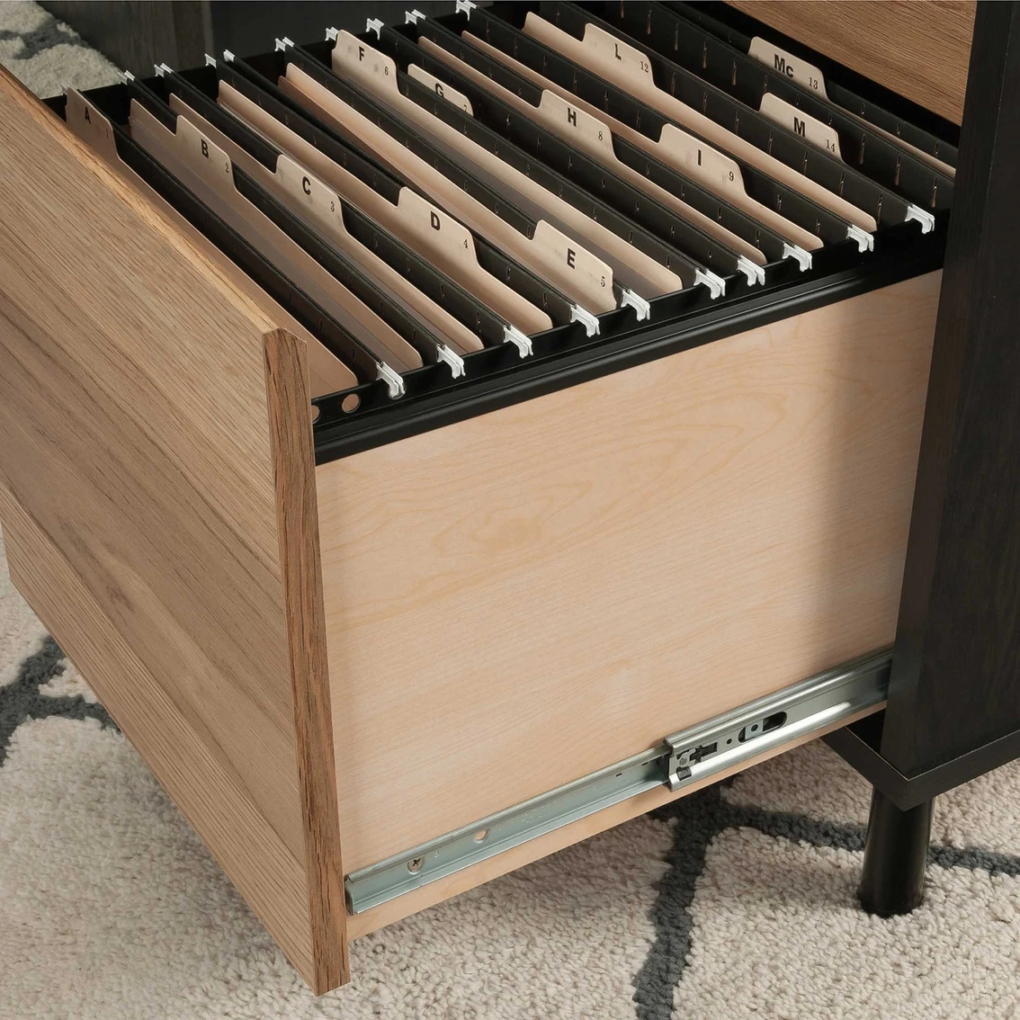 This L-shaped home office desk features a small storage drawer that opens and closes on smooth metal runners for smaller items, and has a lower drawer with full extension slides that can hold letter-size hanging files. A small open shelf as well as a lower shelf adds additional storage for books, your planner, and more. This desk with file drawer can accommodate an optional Hidden Wireless Qi Compatible Charger by Eggtronics 425905 (sold separately – visit sauder.com for more information) for wireless phone charging capabilities.