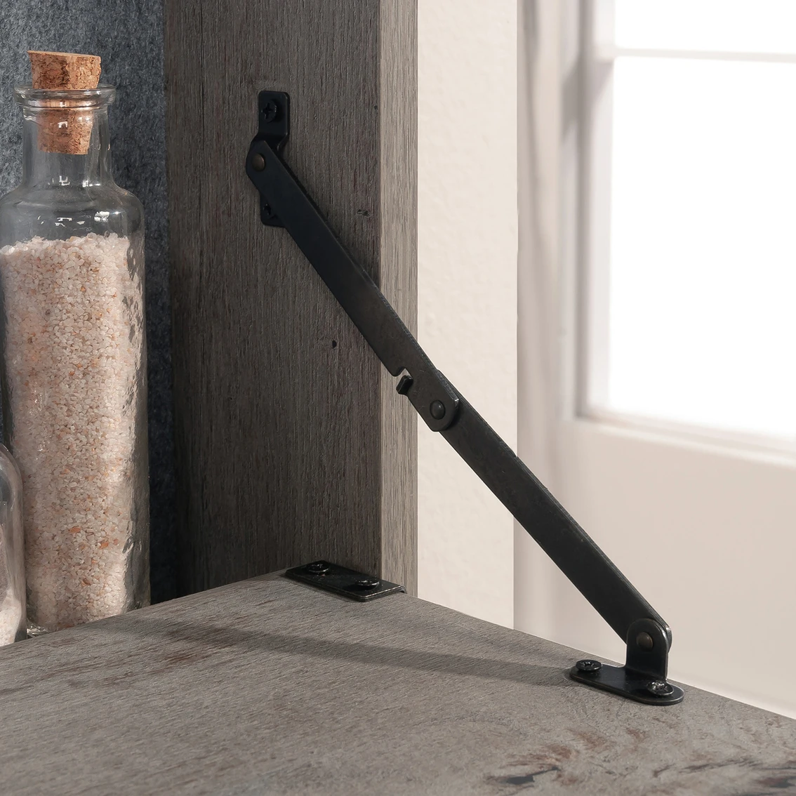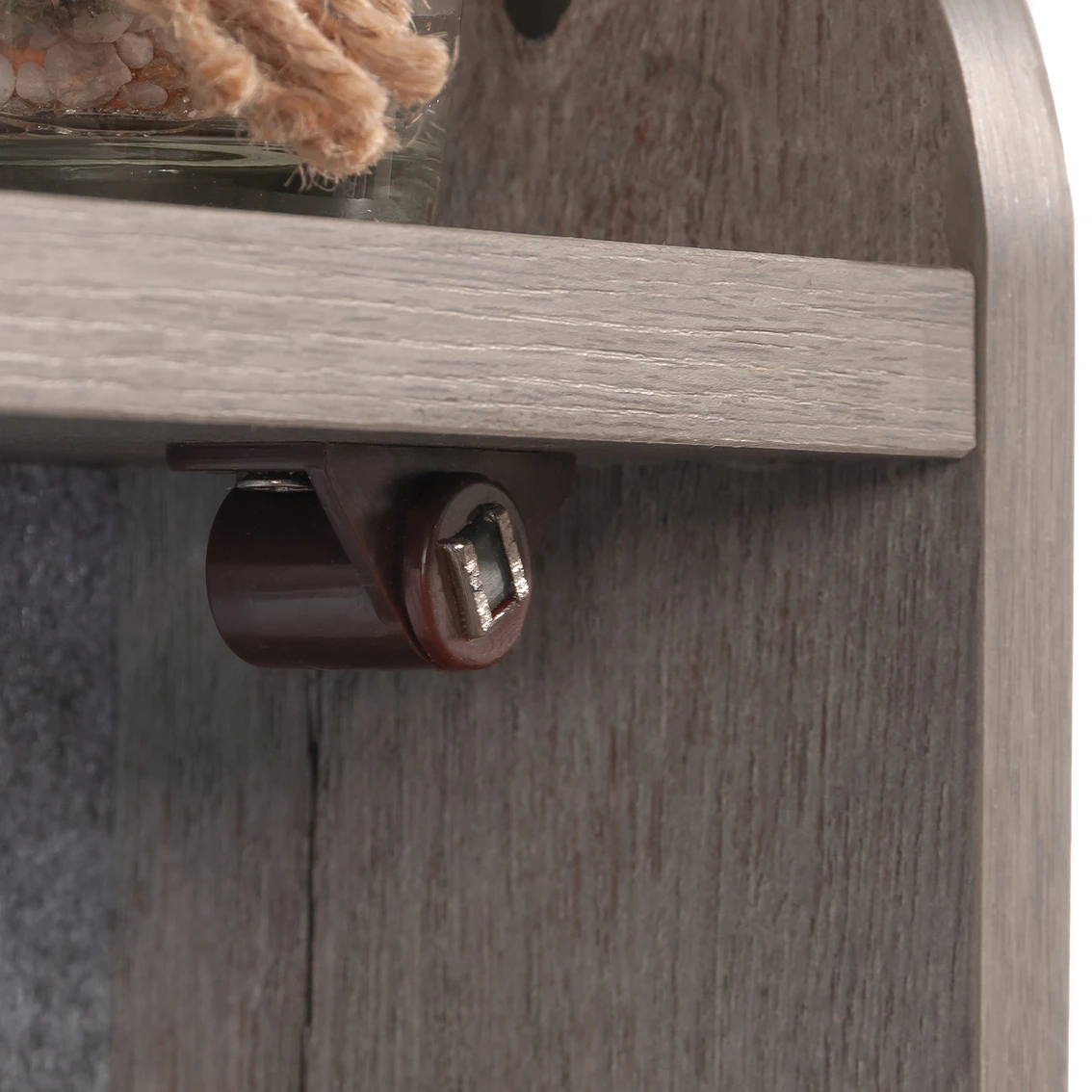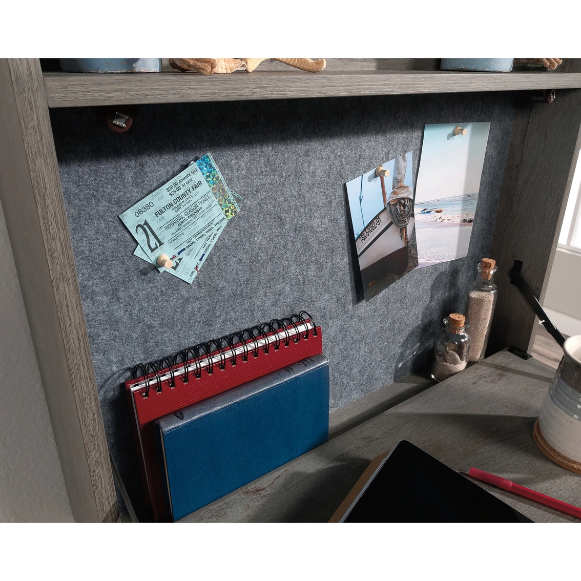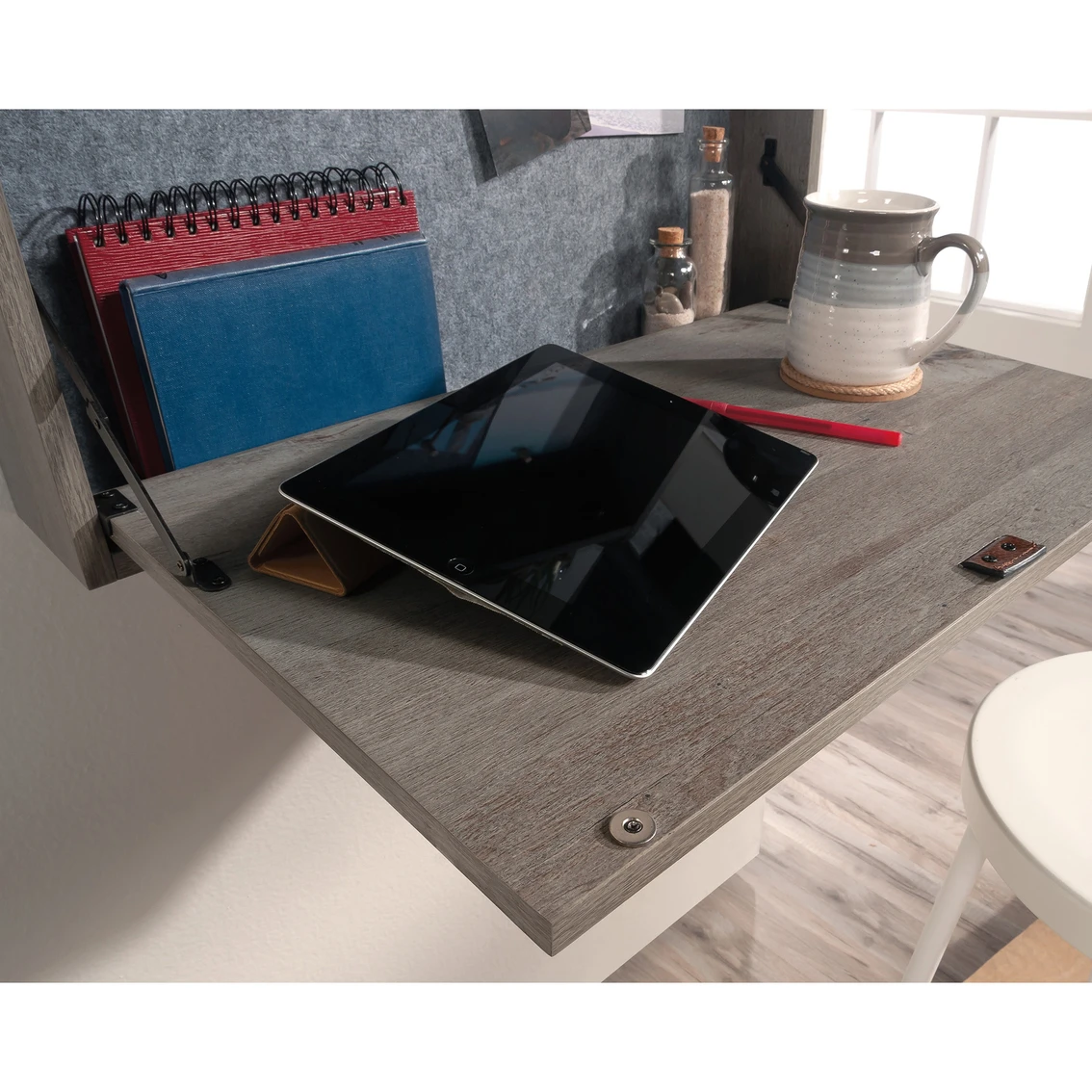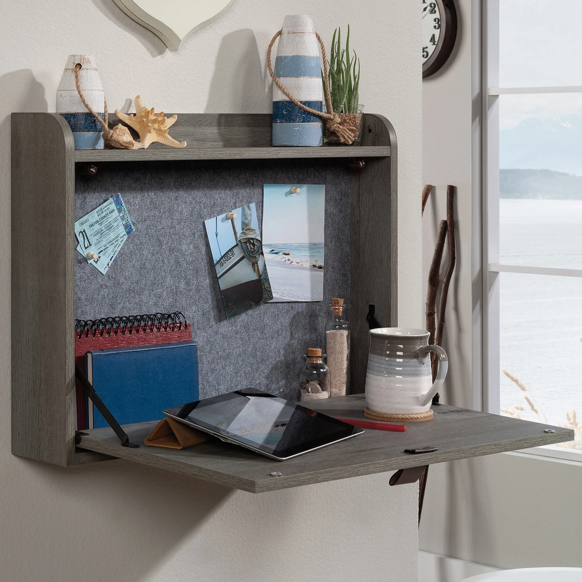 The door flips down to create a spacious work surface that can accommodate your laptop, stacks of notepads, your favorite coffee mug, or a writing pad. Behind the flip-down door of this hanging desk is a gray felt tack board where you can post your to-do list, photos of family members, and mail to be dropped off at the post office. This space saving desk also includes an upper display shelf for small home décor items and knick-knacks. Finished in Mystic Oak, this floating desk is the small space solution for you! Model: 431224.
