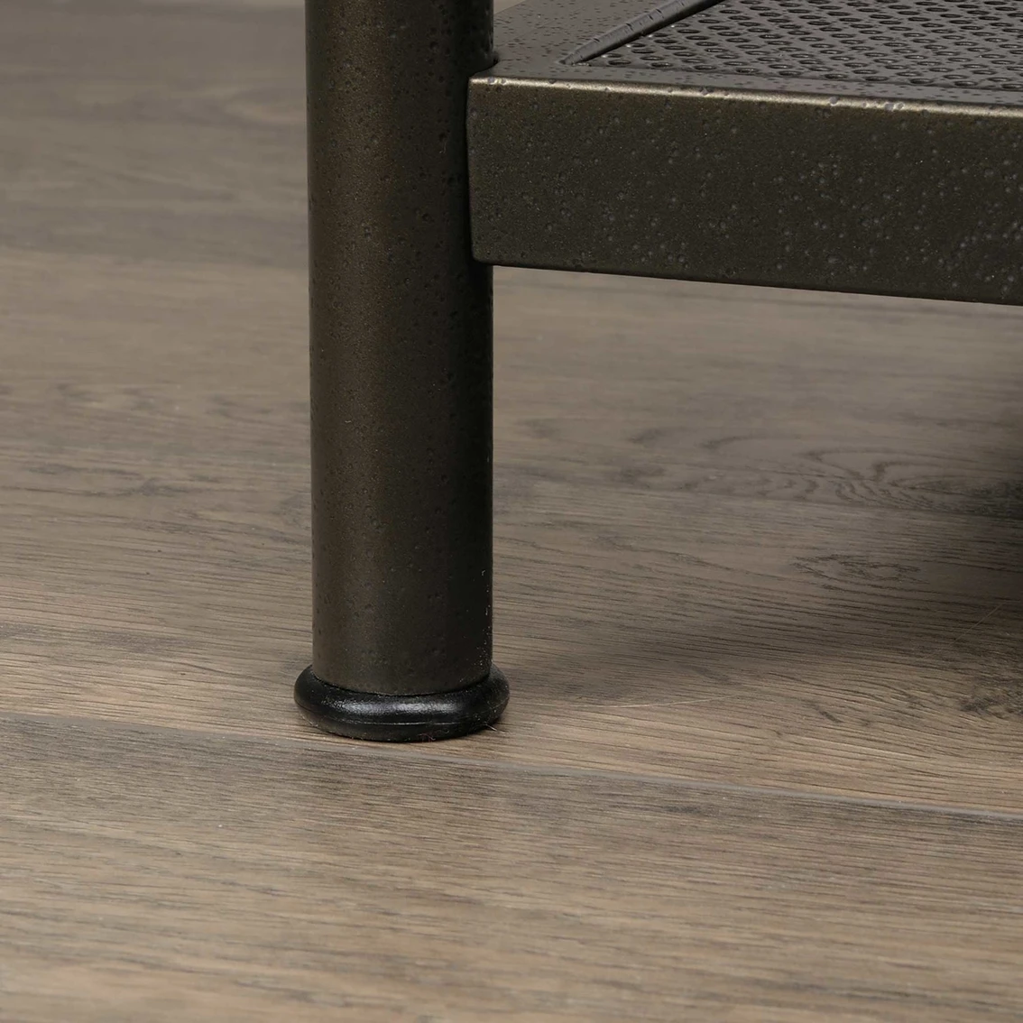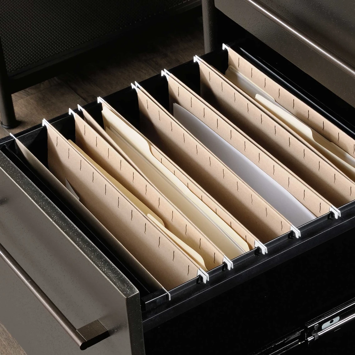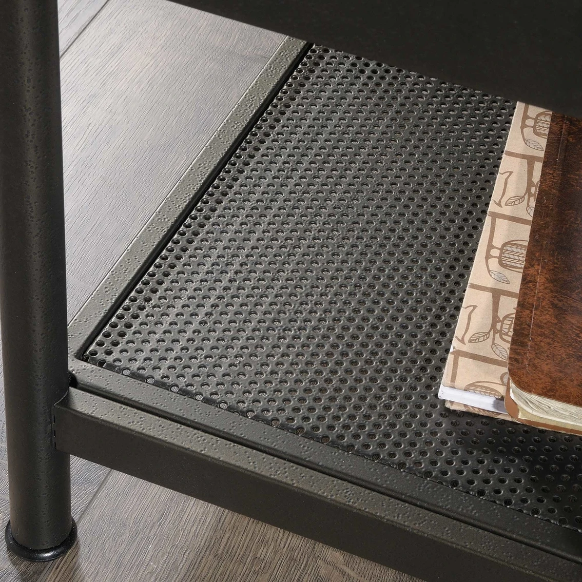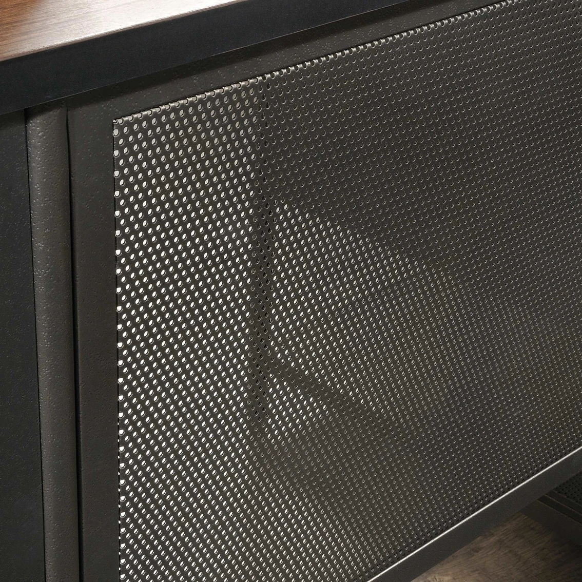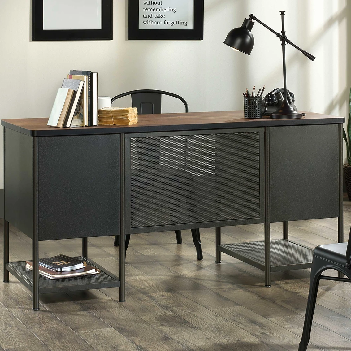 Create the wow factor in your home office or workspace with this industrial inspired executive desk from Sauder’s Boulevard Cafe collection. Its spacious tabletop provides you with room for your laptop, folders, stationery and all other office essentials, including your coffee mug. It features three drawers with full extension slides that open and close on smooth metal runners. Meet all your filing needs with the two lower drawers that accommodate letter-size hanging files. For additional storage, it also includes a cubbyhole along with two lower open shelves for easy access storage of books and papers. It is constructed from a durable powder-coated metal frame and is accented with perforated metal panels to add an extra splash of unique style to this already beautiful office desk. Finished on all sides in black with a Vintage Oak accent, this visually stunning desk gives your office an exclusive look and will have you feeling like a top executive. Model: 420701.