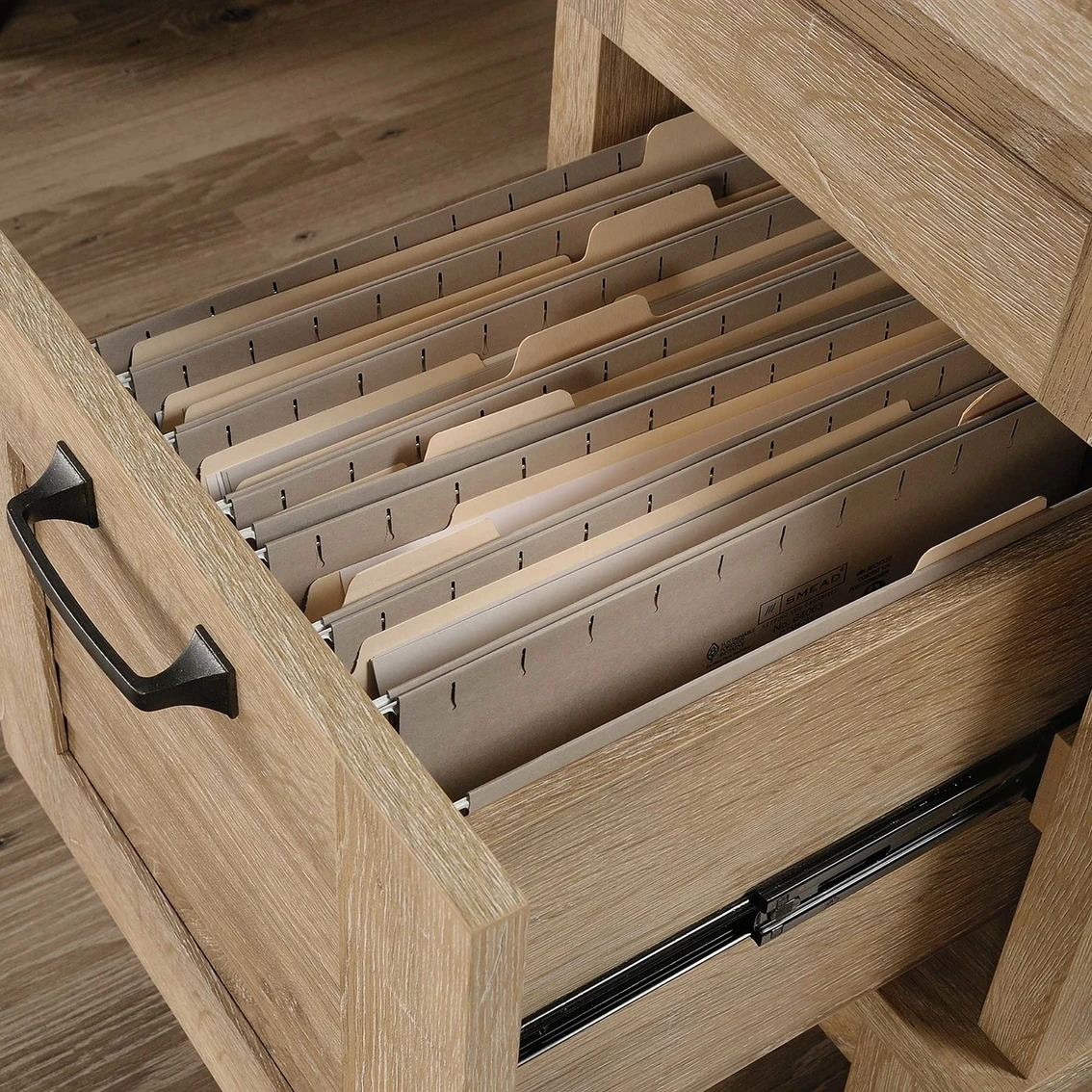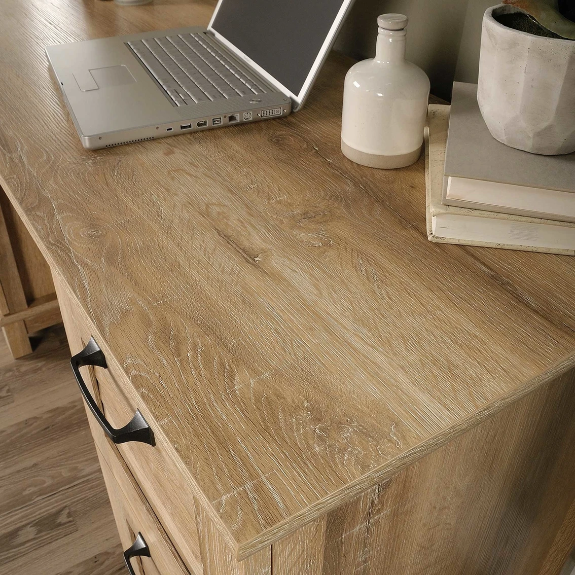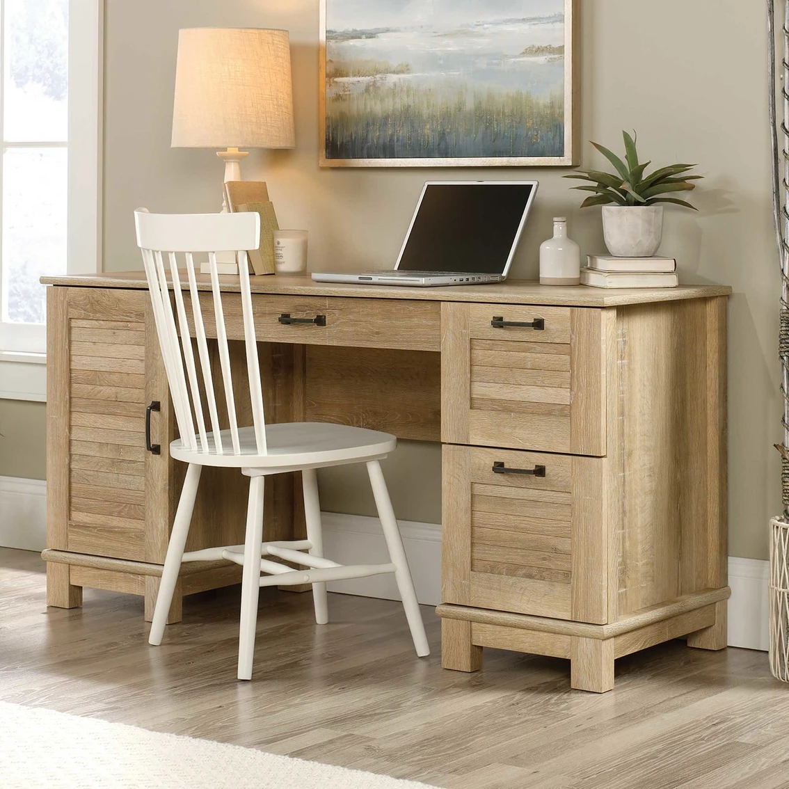 Whether it’s jotting down your next grocery list or working on a big project, your home needs the perfect place to do so. Create a versatile work area in your home with this computer desk from the Sauder Garden Villa collection. This double pedestal desk features a strong and lightweight panel construction that makes this desk easy to relocate if you decide to move it to another area in your home. Its spacious top surface provides you with the room you need for desk essentials like your laptop, stacks of folders, notepads and even a little home decor too. This home office desk features three drawers with full extension slides for easy access storage of miscellaneous supplies. The lower drawer can hold letter-size hanging files to help organize all your important documents. Behind the louver detailed door is a hidden storage area that includes an adjustable shelf and can accommodate a vertical CPU tower. Finished in Orchard Oak and detailed with attractive hardware, this small office desk is just what your home has been missing. Model: 424108.