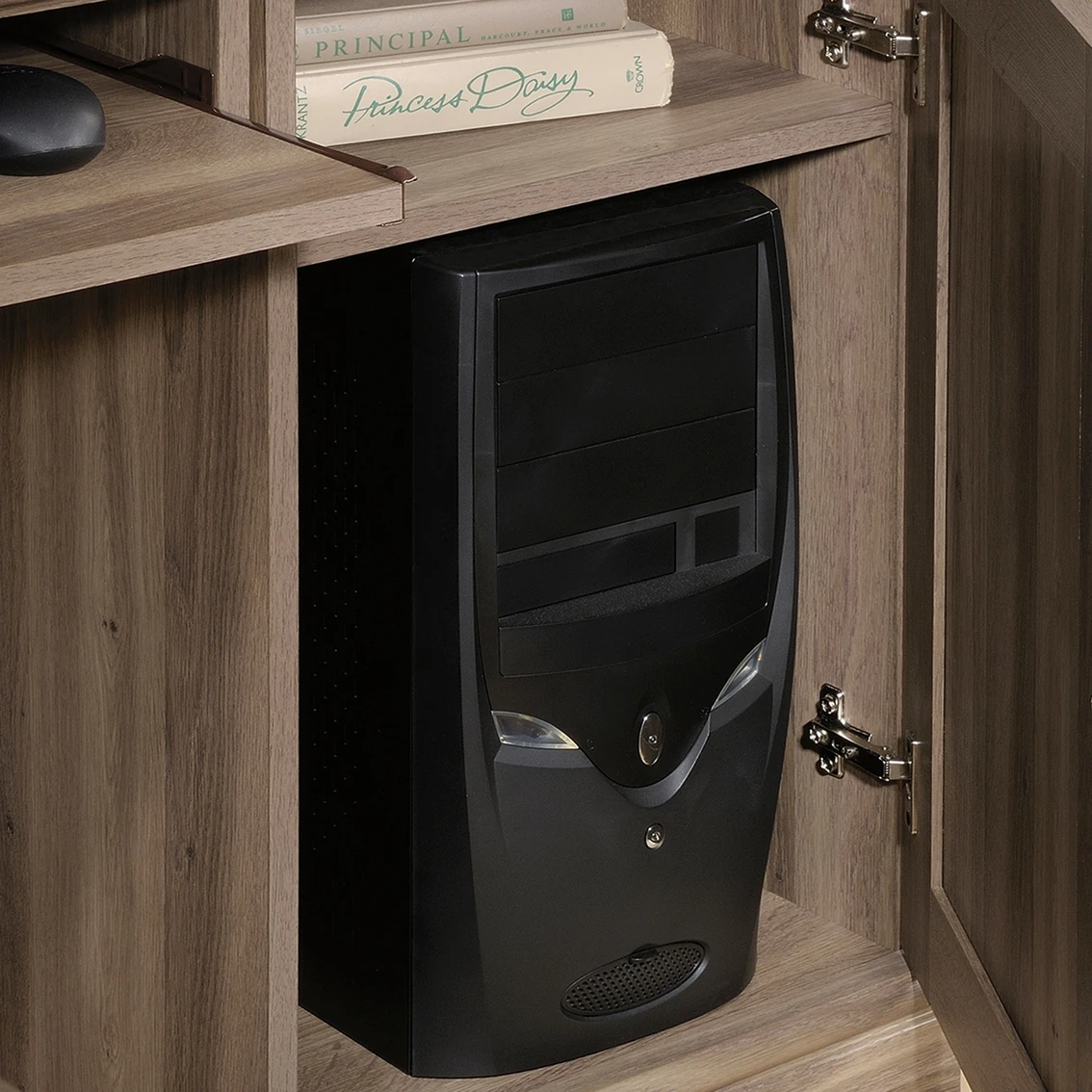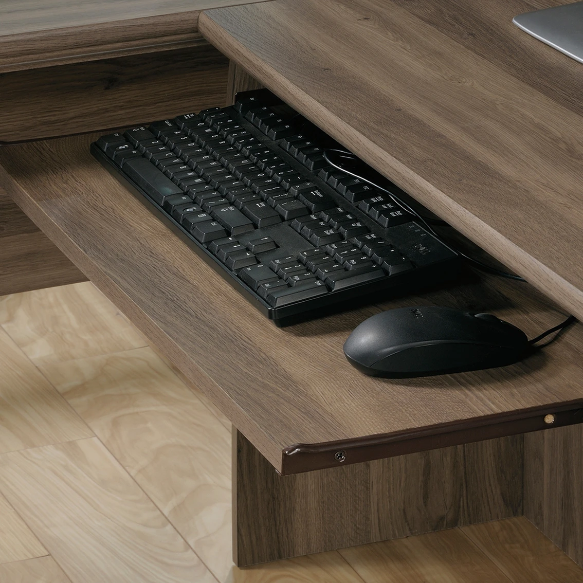 Maximize the overall space in your home office or work space with this corner computer desk from the Sauder Harbor View collection. Need a little elbow room? No problem. This office desk provides you with a large desk top surface where you can lay out all your work and have all your must-have desk essentials like your laptop, notepads, a cup for of pens and of course your coffee mug, too! It features a slide-out keyboard/mouse shelf that glides on smooth metal runners and two storage drawers for easy access storage of miscellaneous office items like your scissors and stapler. The lower drawer holds letter or European size hanging files so you can keep all your important papers organized. Behind the framed panel door is a hidden storage area that includes an adjustable shelf and can also accommodate a vertical CPU tower. This desk also features a grommet hole so you can keep all your wires neat and out of the way. Finished in Salt Oak and detailed with stylish hardware, this beautiful desk is an office dream come true.