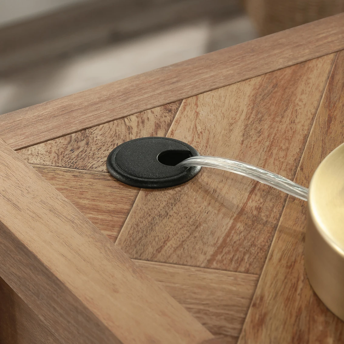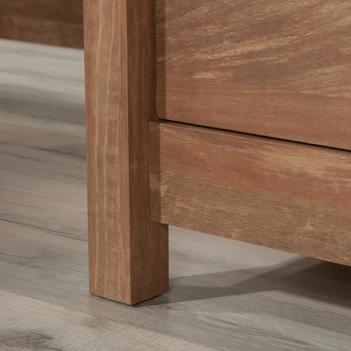 Add the warmth and familiarity of the Sauder Cannery Bridge collection to your home or workspace with this L-shaped desk. This home office L-shaped desk features six drawers with full extension slides, perfect for storing pens, a stapler, notepads and other office supplies. The two lower drawers hold letter or legal-size hanging files, keeping you organized and clutter free. The spacious top surface of this farmhouse L-shaped desk can easily accommodate your computer, a lamp, photos of your family and features a herringbone pattern for added detail. Includes a cord management system with desktop grommet holes to organize chargers and cords to keep your desk free of an entanglement of wires. Finished on all sides for versatile placement, this modern farmhouse desk will look polished from every angle. Finished in a warm Sindoori Mango. Ships in two cartons. Model: 429556.
