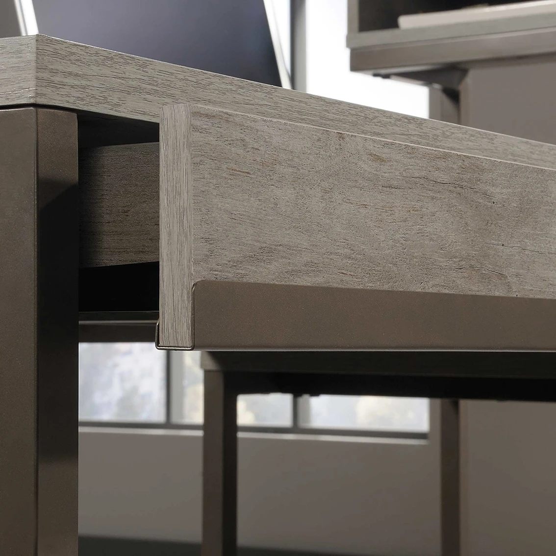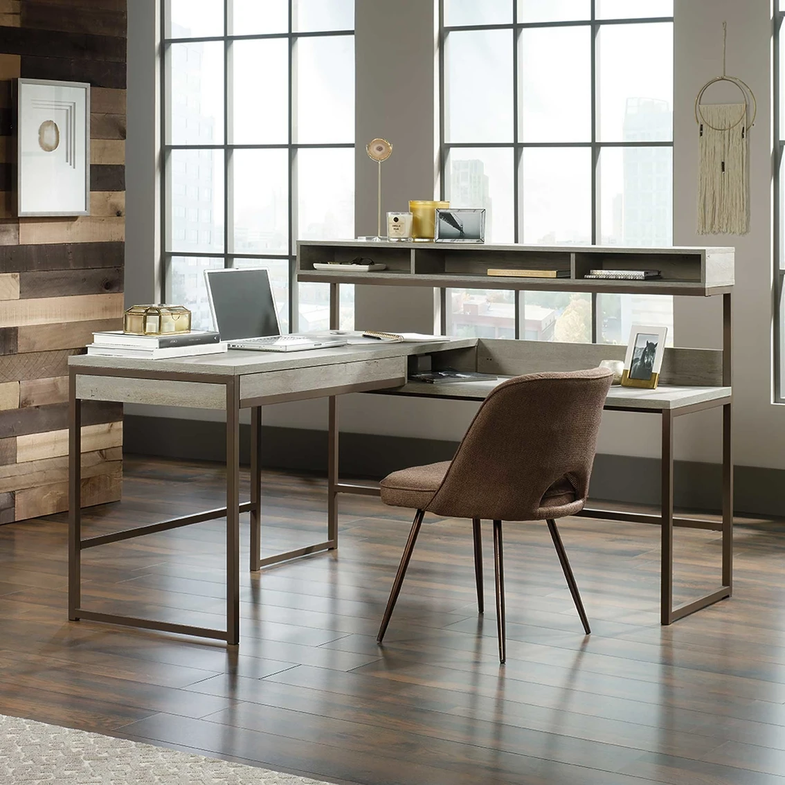 Your office desk should be just a stylish as you are. Upgrade the look of your home workspace with the sophisticated style and elegant design of this L-shaped desk from Sauder’s Manhattan Gate collection. Its spacious L-shaped top surface provides you with all the room you need for your must-have desk essentials like your laptop, work binders, notepads and your coffee mug. You can even find a place for home decor items like decorative plants and picture frames. This corner computer desk features a storage drawer that opens and closes on smooth metal runners for convenient storage of miscellaneous supplies. It also features an elevated shelf with cubbyhole storage for easy access of items like envelopes and folders. This home office computer desk is finished on all sides for versatile placement throughout your home. It features a strong and lightweight 1-in. panel construction along with a powder-coated metal frame. Finished in Mystic Oak, this handsome corner work station is just what your home is missing. Model: 423446.