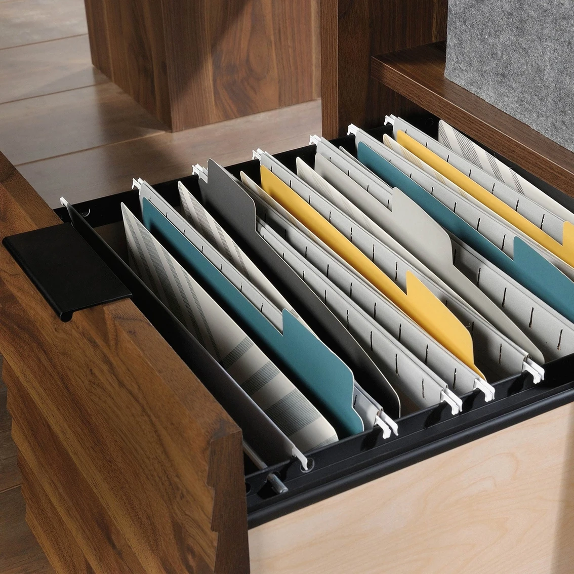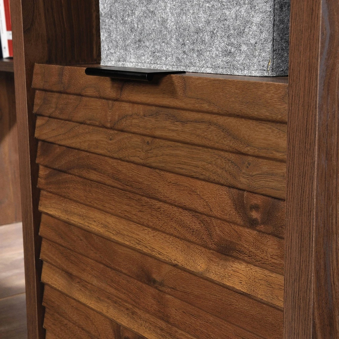 Your home office can be stylish, too! Update the look of your office space with the Sauder Mid Century Modern L Shaped Office Desk from the Harvey Park collection. This home office desk offers a spacious top surface with ample room for notepads, folders, laptop, and your hot cup of coffee. This L-shaped computer desk even has plenty of space for home décor items like a table lamp and framed photos. The lower file drawer with full extension slides organizes letter-size hanging files. Plus, the open storage space includes an adjustable shelf that can move to different heights to store items of all shapes and sizes, including work binders and miscellaneous supplies. This desk with drawer features a strong and lightweight 1-in. panel construction and is finished on all sides for versatile placement. Finished in Grand Walnut, this small office desk will have you feeling motivated and ready to work. Model: 426509.