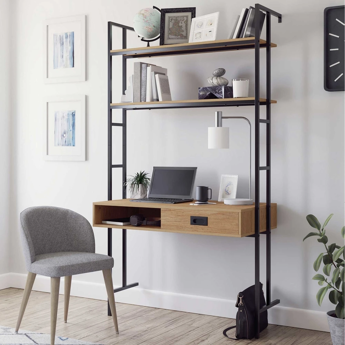 Create a convenient spot in your home office to work on your next big project or simply jot down your grocery list with this wall-mounted desk from the Sauder New Hyde collection. This desk with drawers and shelves offers a work surface with ample space for desk essentials like notepads, folders, laptop and an accent lamp. The wall desk’s two storage drawers open and close on smooth metal runners for easy-access storage of pens, envelopes, highlighters and stamps. This desk has shelves above to provide space to store and organize items like knick-knacks, organizing bins and photos of your family and friends. Its mid-century design paired with its durable, black powder-coated metal frame adds a touch of style that is sure to stand out in your home. Finished in Serene Walnut, this unique home office desk is everything you never knew you needed.