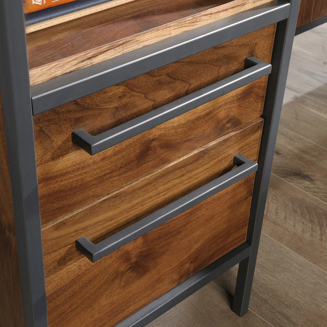 Find the motivation you need to tackle all your big projects when you give your home office a touch of modern style and design with this L-shaped desk from the Sauder Nova Loft collection. This metal and wood desk offers a spacious top surface that provides you with all the room you need for office essentials like your laptop, stacks of folders, notepads and your hot cup of coffee. There’s also plenty of space for home decor items like an accent lamp and framed photos. The two storage drawers open and close on smooth metal runners for easy access storage of all your miscellaneous supplies. There’s also two open shelves for additional storage space for things like papers and envelopes. The file drawer with full extension slides can hold letter-size hanging files for increased organization. This home office desk is finished on all sides for versatile placement throughout any room in your home. Finished in Grand Walnut and paired with a durable, black powder-coated metal frame, this L-shaped desk will have you feeling ready to work. Assembly required.