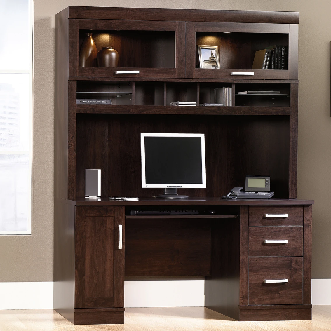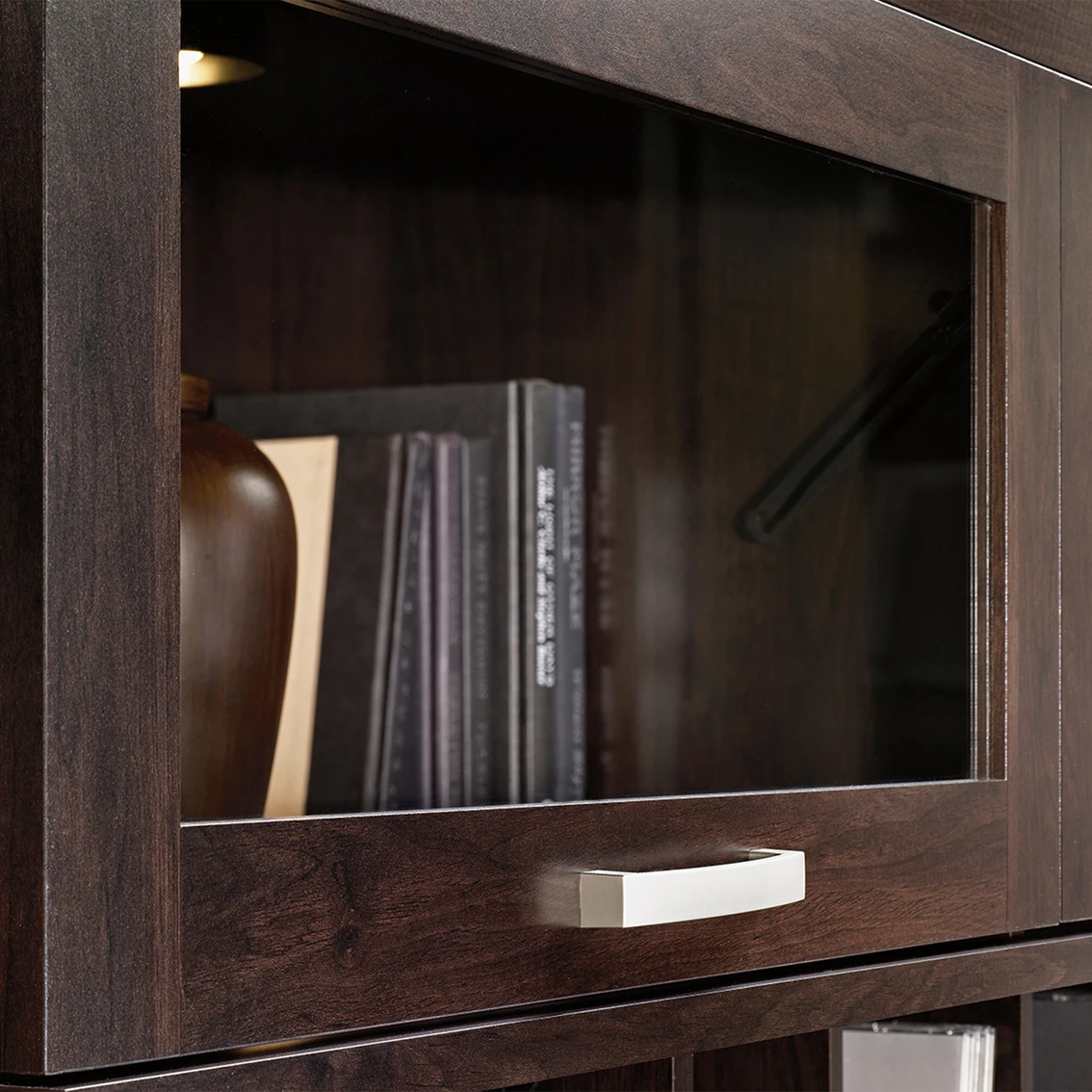 Give your office or workspace a little extra style and a whole lot of extra storage with this hutch from Sauder’s Office Port collection. This handy hutch features two framed, safety-tempered glass doors that flip up and lock in position. These storage compartments make the perfect place to not only store books and other office supplies, but also to display home decor and your prized possessions. Also, behind each door is a display light so that you can illuminate and show off all your belongings. It also features cubbyhole storage that includes two adjustable, safety-tempered glass shelves for additional storage and display. This handsome hutch attaches to Computer Credenza 408291 to give your office a completed look. Finished in a stunning Dark Alder, this hutch adds elegant style and functionality to your office. Model: 408292.
