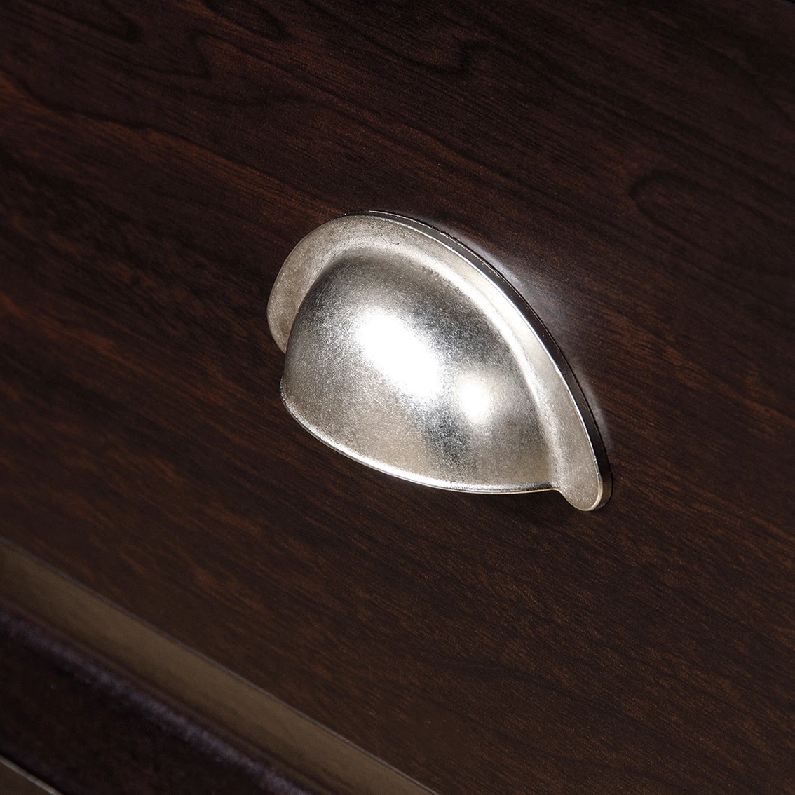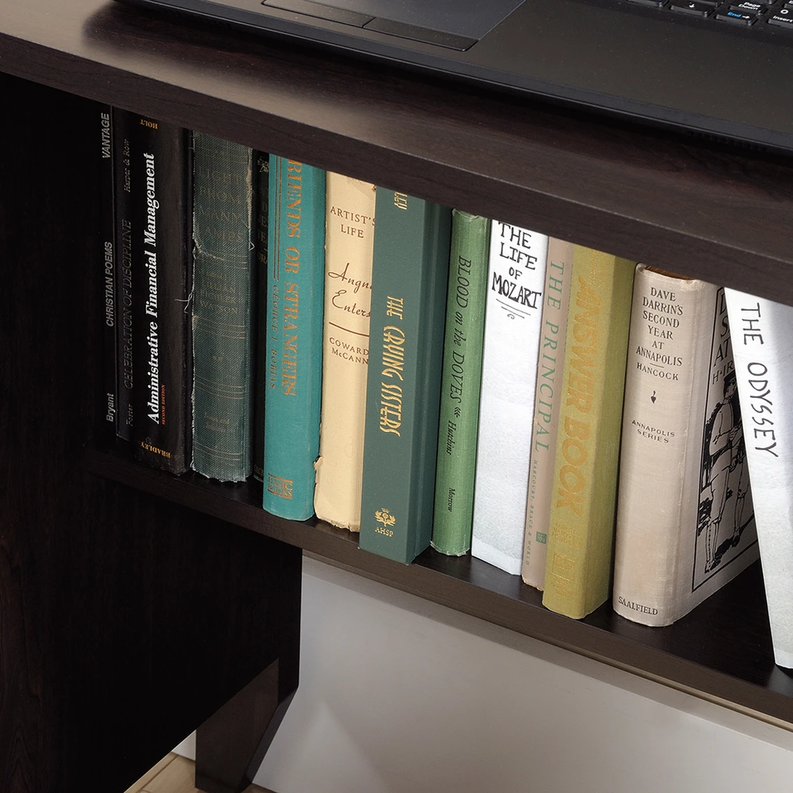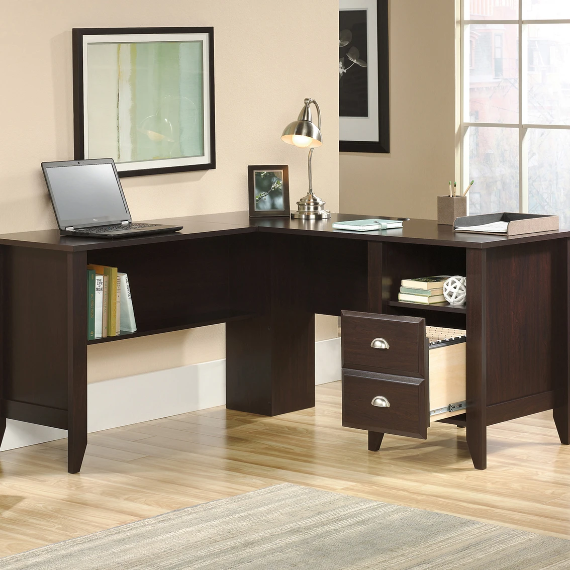Add some extra room to your work space with this L-shaped desk from the Sauder Shoal Creek collection. Its extra spacious tabletop provides you with room for all your office essentials — laptop, lamp, paper, you name it! It features a file drawer will full extension slides to hold letter-size hanging files, grommet holes and pass-throughs for cord management, and a lower shelf for additional storage. Finished on all sides in Jamocha Wood, this desk is everything you need and more for your office!