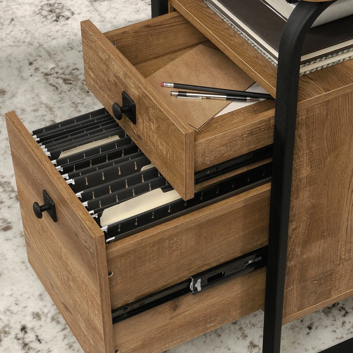 - Lower drawer with full extension slides holds letter-size hanging files