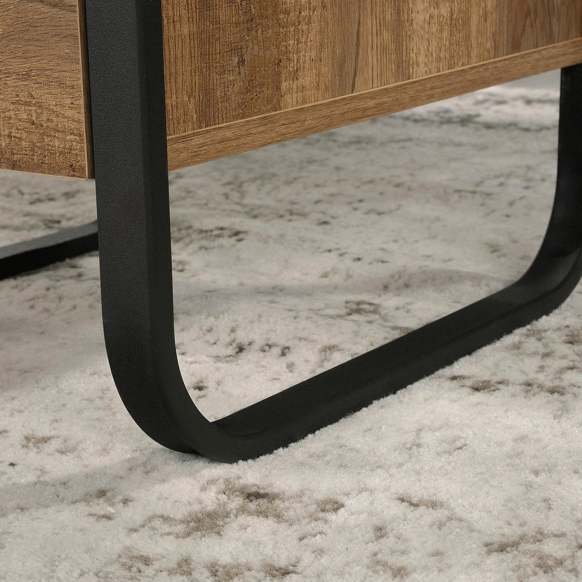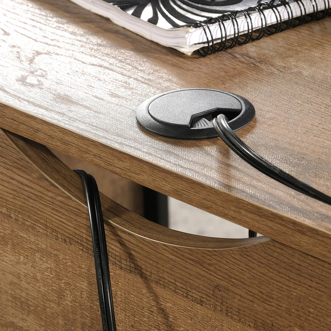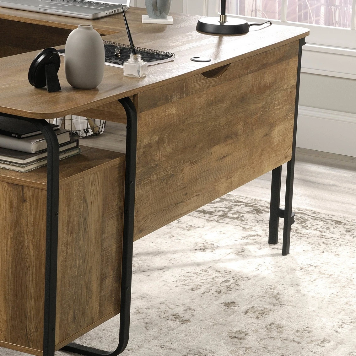 Find the motivation to tackle all your big projects when you add the rustic-inspired style and functional design of the L-shaped desk from the Sauder Station House collection. This home office desk offers a spacious top surface with ample room for your office essentials like notepads, a table lamp, laptop and hot cup of coffee. The small storage drawer opens and closes on smooth metal runners for easy-access storage of all your miscellaneous supplies. The lower drawer with full extension slides can organize letter-size hanging files. Need more? This small office desk also includes a cubbyhole area to conveniently store papers and binders. Desk includes two desktop grommets for cord management. Attractive from every angle, this L-shaped desk with storage is finished on all sides for versatile placement. Finished in Etched Oak and detailed with a textured, powder-coated metal frame, this industrial desk will inspire you to work.