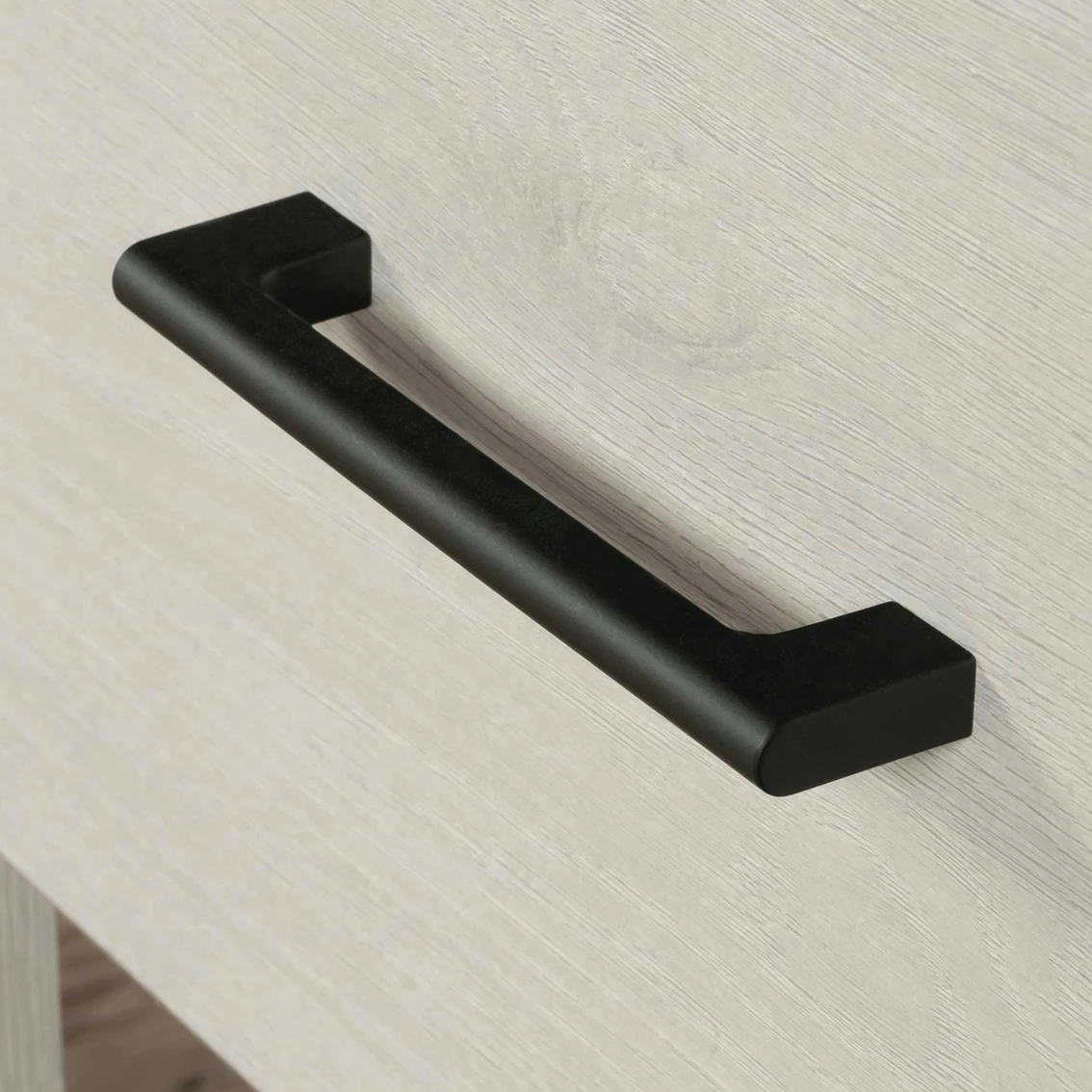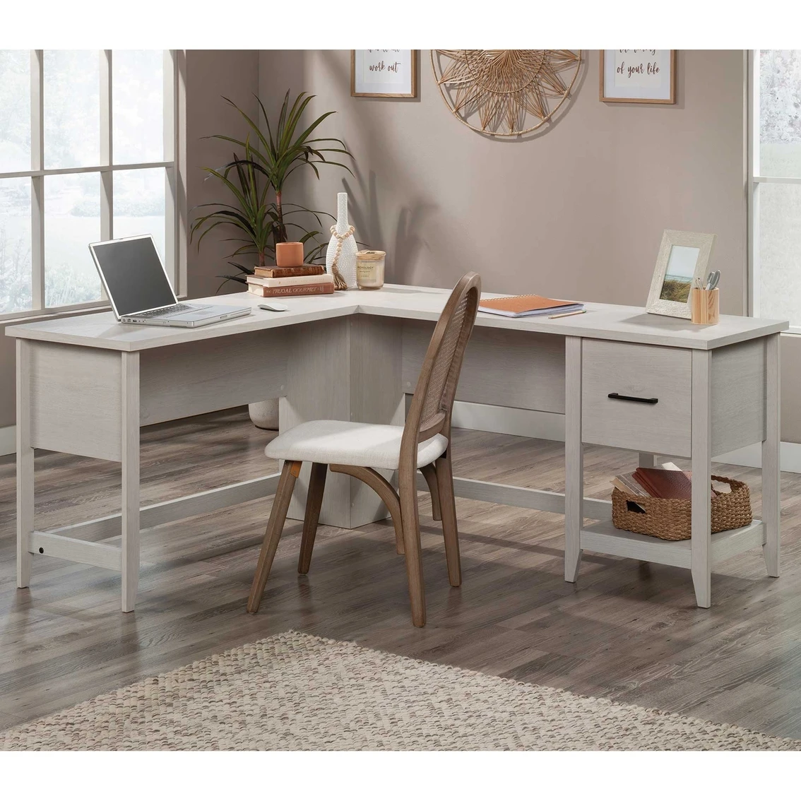 A classic L-shaped desk with some modern flair — the L-shaped home office desk from the Sauder Summit Station collection delivers that and more. This transitional desk includes a file drawer with full extension slides that holds letter-size hanging files. If hanging files aren’t your thing, this L-shaped desk with drawer is perfect for storing your sticky notes, planner, small documents and more. Includes an open shelf for additional placement of decor, books and items you need to have handy. A large top surface space can display your laptop, lamp, cup of coffee and photos of family. Finished on all sides for versatile placement anywhere, this L-shaped computer desk will look polished from every angle. A cord management system with two desktop grommets makes cord clutter a thing of the past. Crisp Glacier Oak finish with tapered feet and chamfered edges. Model: 432013.