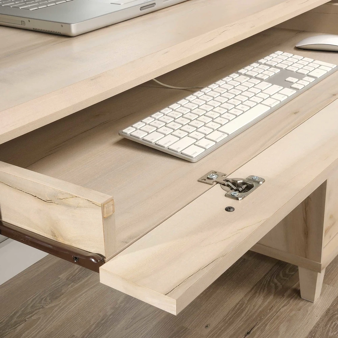 Creating a stylish home office has never been easier. Get motivated to tackle all your big projects when you add the charming style and design of this desk from the Sauder Willow Place collection. This home office desk offers a spacious top surface that provides you with the room you need for items like your laptop, stacks of notepads, folders and even a little home décor too. The drawer/shelf features a flip-down panel for your laptop or keyboard and mouse. The small storage drawer opens and closes on smooth metal runners for easy access storage of items like envelopes and stamps. The large lower drawer with full extension slides holds letter-size hanging files for increased organization. Need more storage? The open cubbyhole area provides a space for easy access storage of miscellaneous supplies. Finished in Pacific Maple and accented with tapered feet and soft chamfered edges, this gorgeous work desk will have your home office space looking top notch.