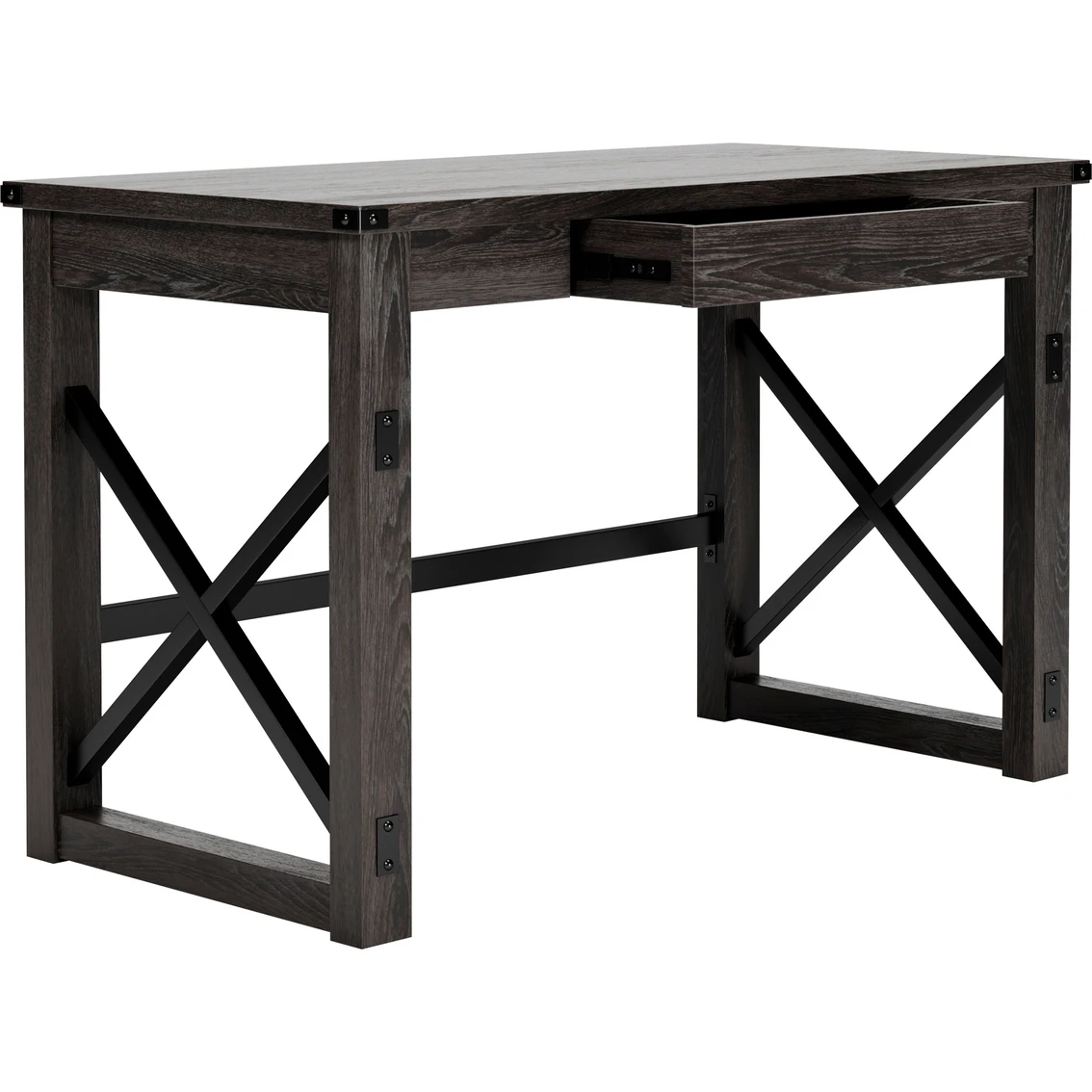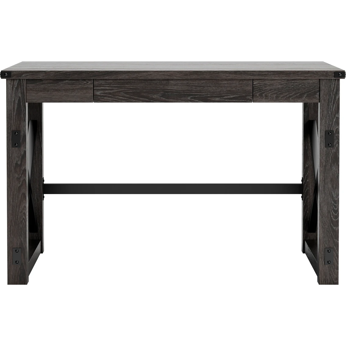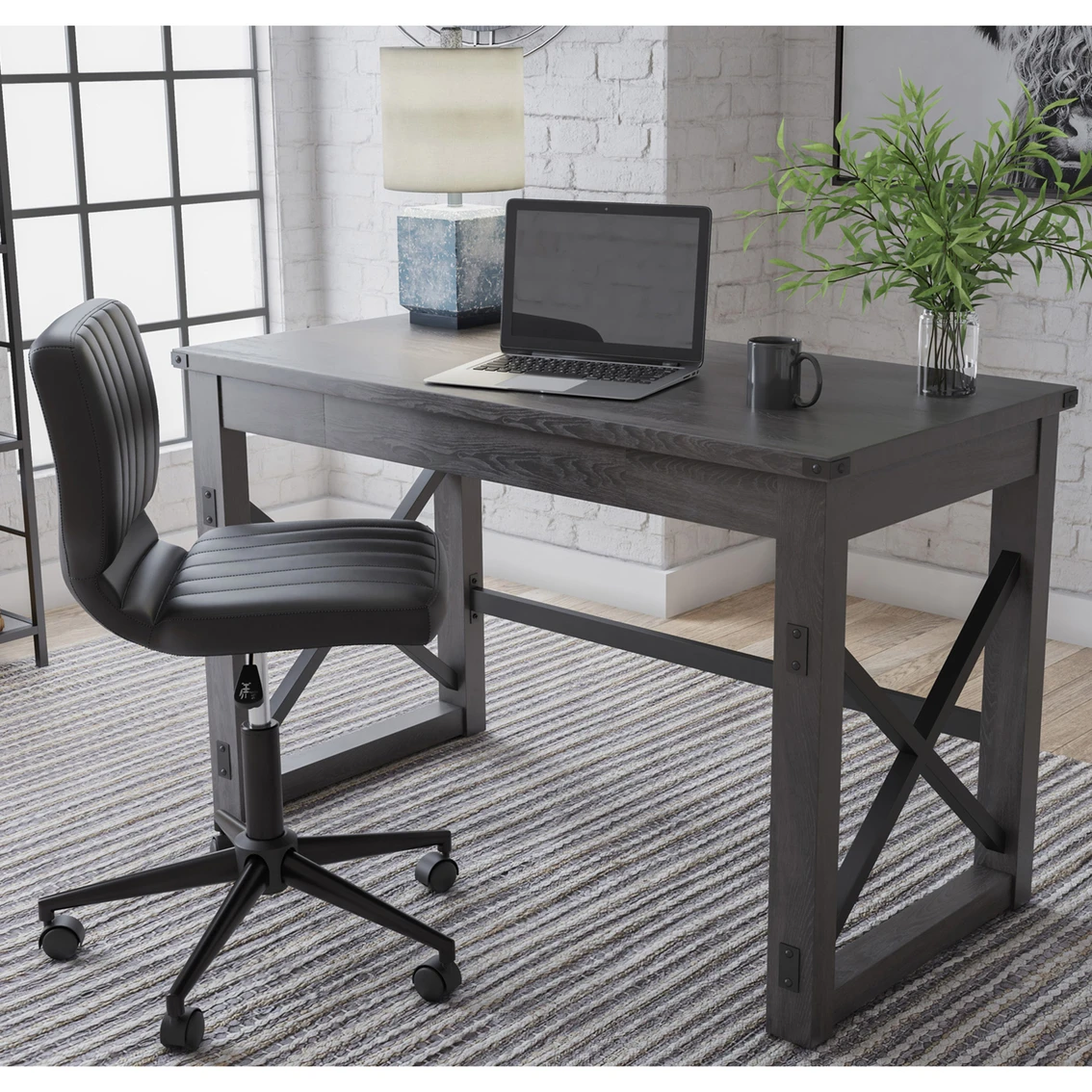 Love an urban farmhouse aesthetic? Make it work to your advantage with the beautifully styled Freedan desk from Signature Design by Ashley. This simply striking choice in home office furniture has an unmistakable farmhouse feel thanks to design elements including a gray decorative wood grain laminate contrasted with cross-buck rails, metal accents and a stretcher in black. Perfect for office supplies, the desk includes a handy center drawer with hardware-less aesthetic to help keep your desk top clutter free. Featured item is desk only; images show options. Model: H286-26.