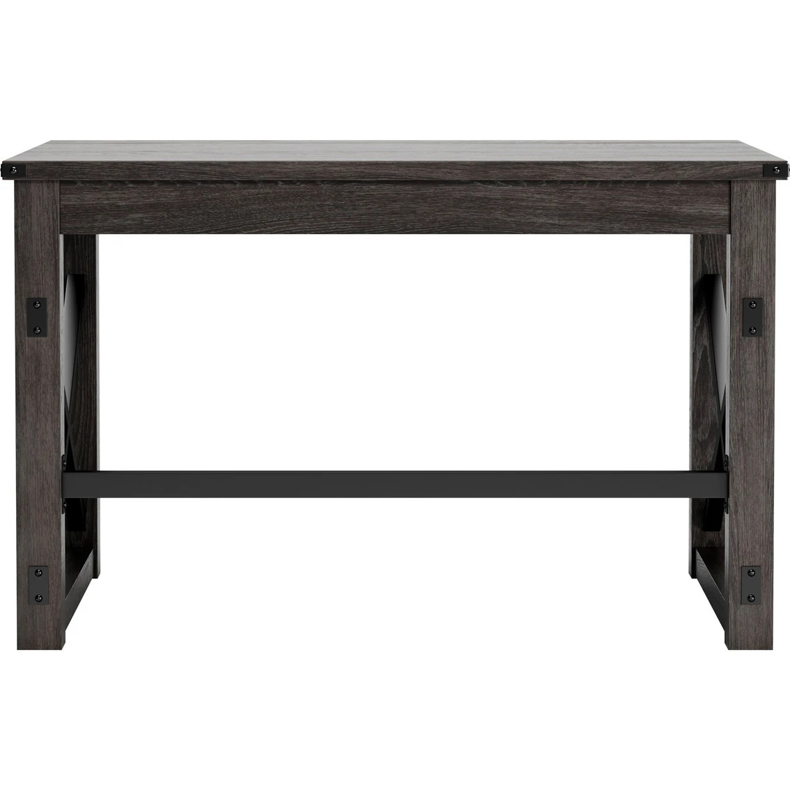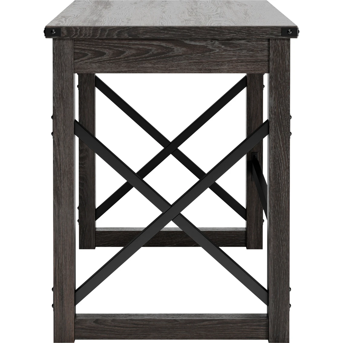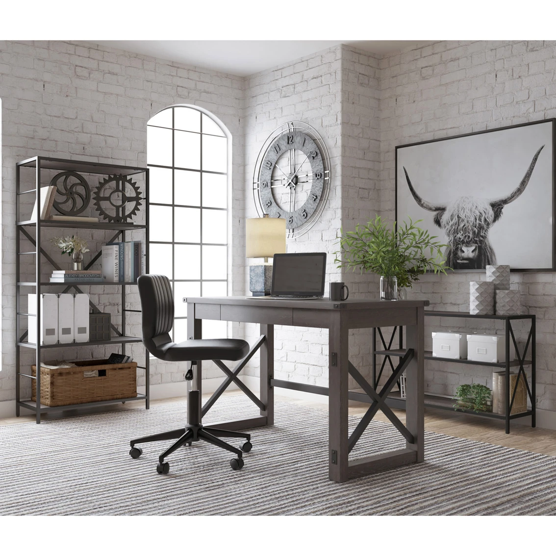 Love an urban farmhouse aesthetic? Make it work to your advantage with the beautifully styled Freedan desk from Signature Design by Ashley. This simply striking choice in home office furniture has an unmistakable farmhouse feel thanks to design elements including a gray decorative wood grain laminate contrasted with cross-buck rails, metal accents and a stretcher in black. Perfect for office supplies, the desk includes a handy center drawer with hardware-less aesthetic to help keep your desk top clutter free. Featured item is desk only; images show options. Model: H286-26.
