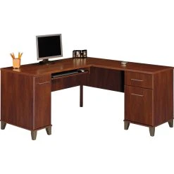 For fans of urban industrial design, the Signature Design by Ashley Starmore desk steals the show. Tabletop is crafted with a mix of acacia veneer and wood beautified with an oiled walnut-tone finish. Incorporation of sleek tubular metal frame and linear, large-scale pulls pull it all together. Cutout shelf on desk’s front side incorporates added dimension. Model: H633-27.