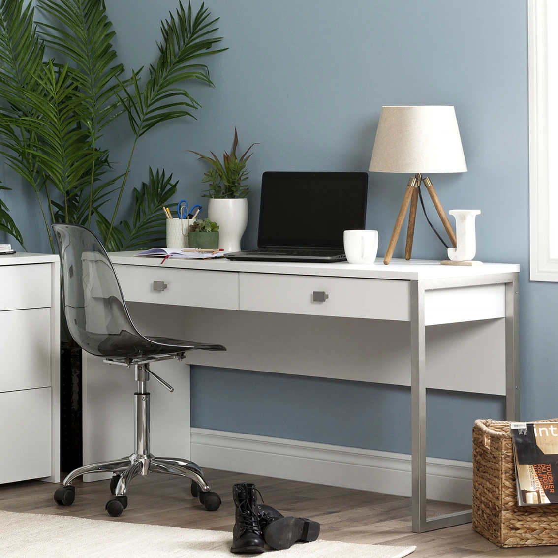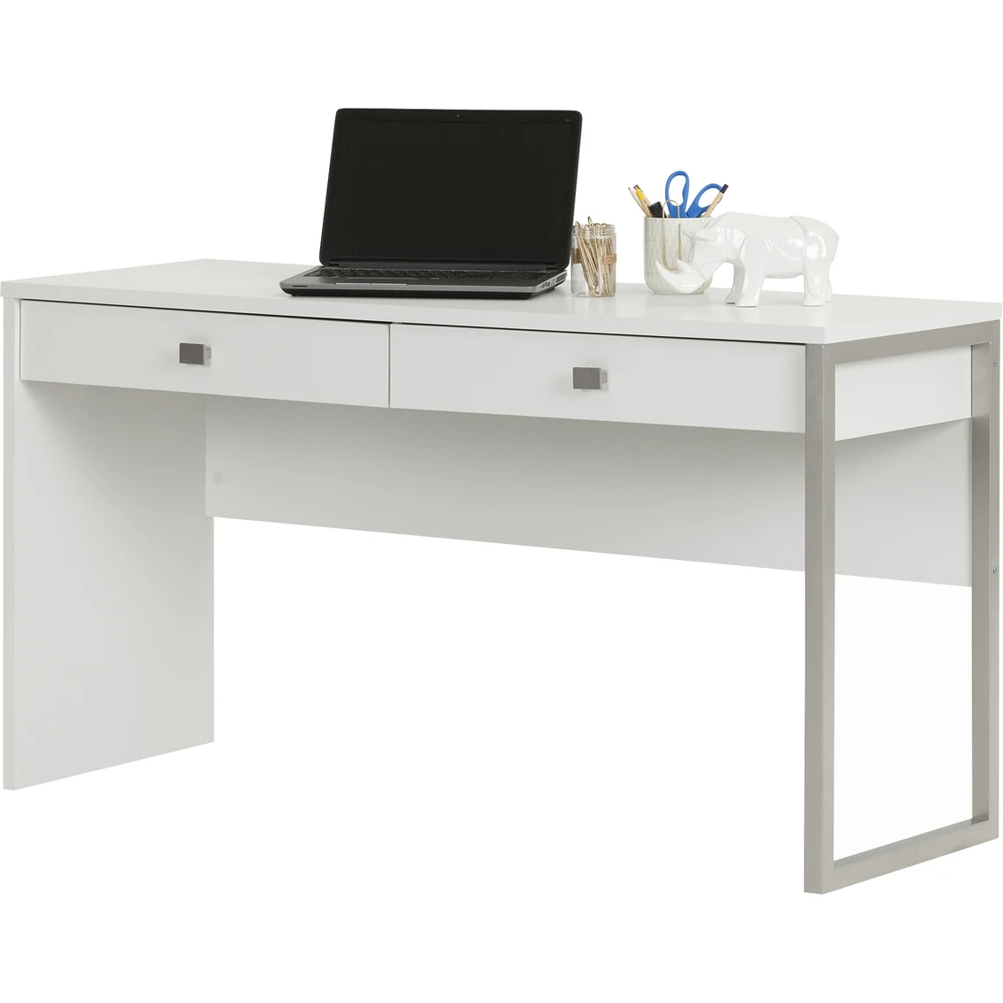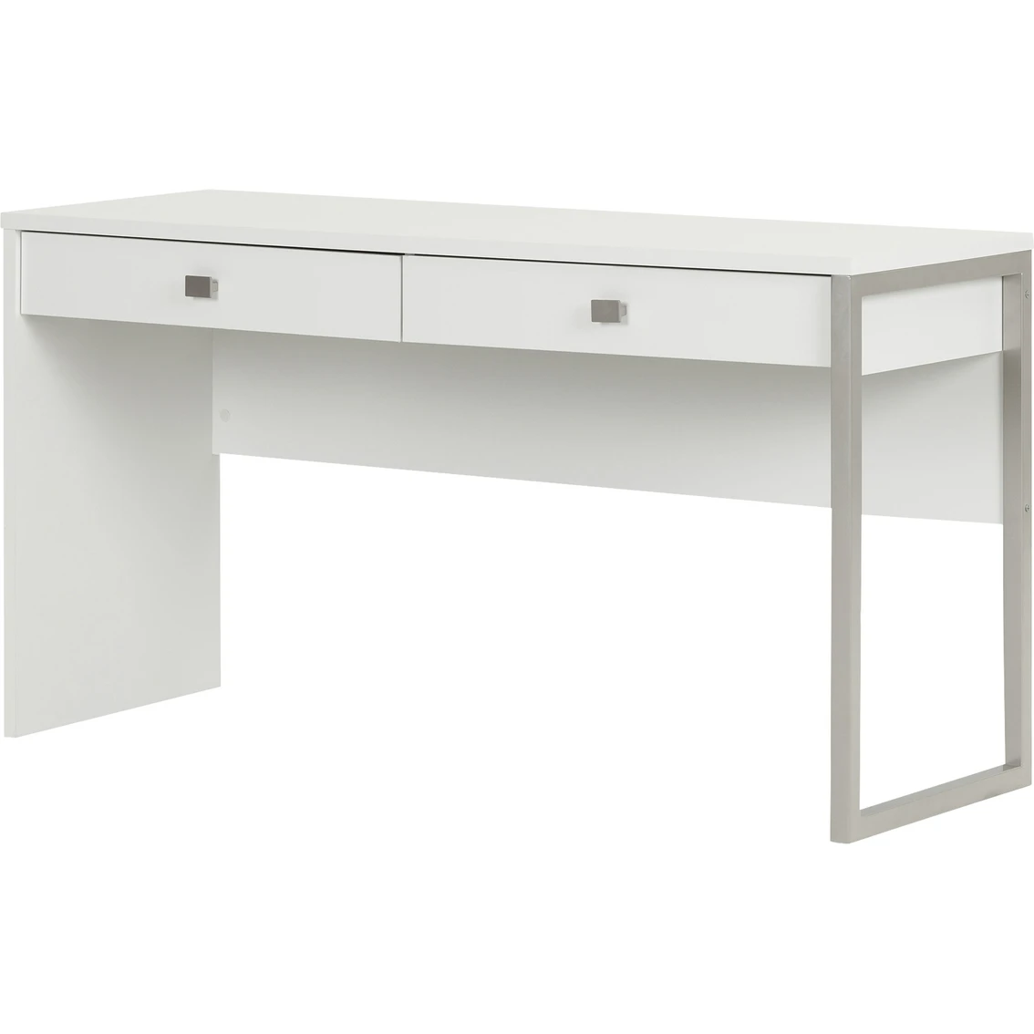This elegant desk from the South Shore Interface collection will satisfy the biggest fans of contemporary style. It features an attractive metal leg and gives you a large work space as well as two storage drawers for your pencils, calculators and other accessories.